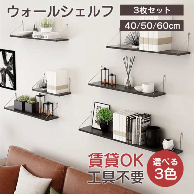ウォールシェルフ 賃貸 3枚セット 40cm 50cm 60cm 木製 ウォールラック 壁掛け 取り付け 吊り下げ棚 壁収納 おし