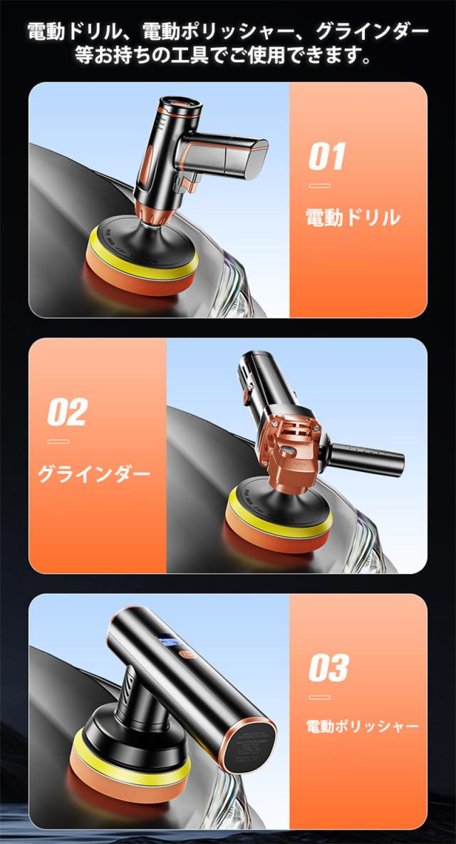 電動ドリル、電動ポリッシャー、グラインダー等お持ちの工具でご使用できます。
