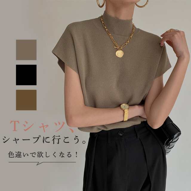 Tシャツ ニットトップス フレンチスリーブ レディース リブニット 半袖 プチハイネック 無地 フラッタースリーブ カジュアル