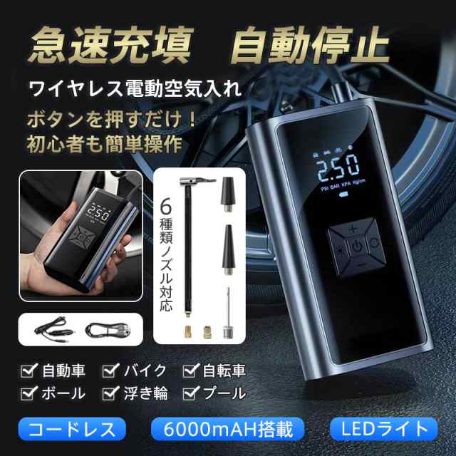 電動 空気入れ 自動車 自転車 充電式 急速充填 コードレス 車 バイク エアーポンプ 自動停止 タイヤ圧力検知 小型 浮き輪 ボ