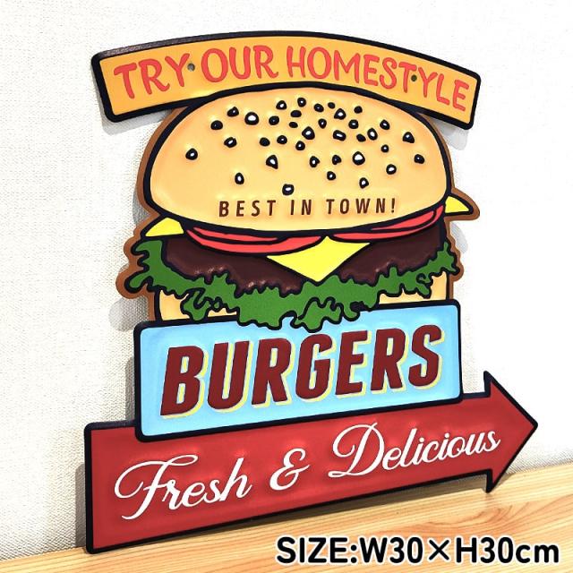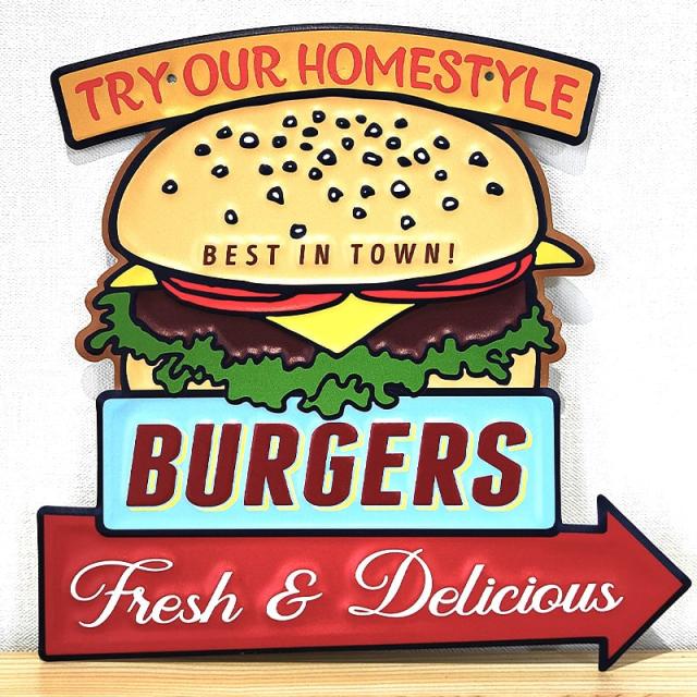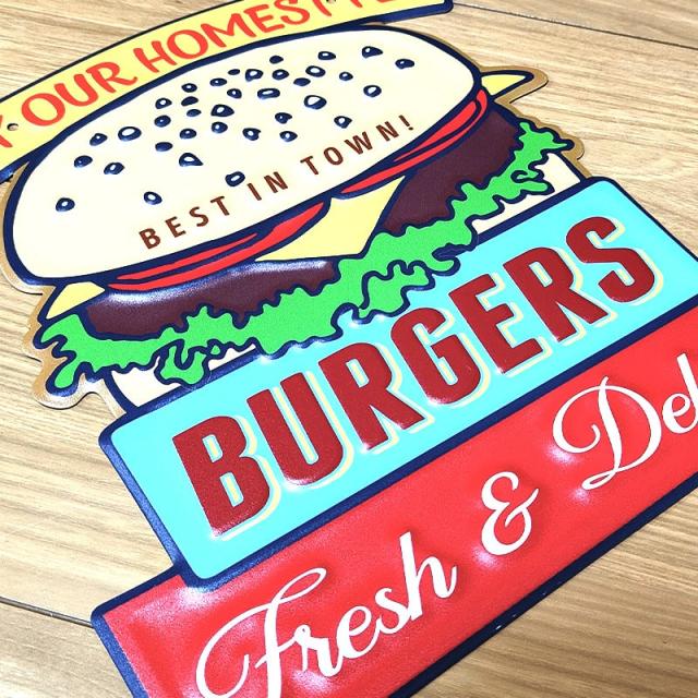 ブリキ看板 ハンバーガー エンボスプレート おしゃれ 壁飾り アメリカン 雑貨 インテリア BURGERS かわいい アンティーク ディスプレイ 壁掛け お店 レストラン カフェ 店舗