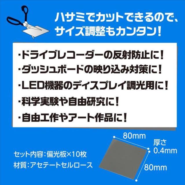 商品詳細:偏光の各種実験に使用できるプラスチック製の偏光板です。薄手シートなので、ハサミ等で切ることができます。 生産国:中国 素材・材質:アセテートセルロース 商品サイズ:80×80×0.4mm 重量:37g セット内容:偏光板×10