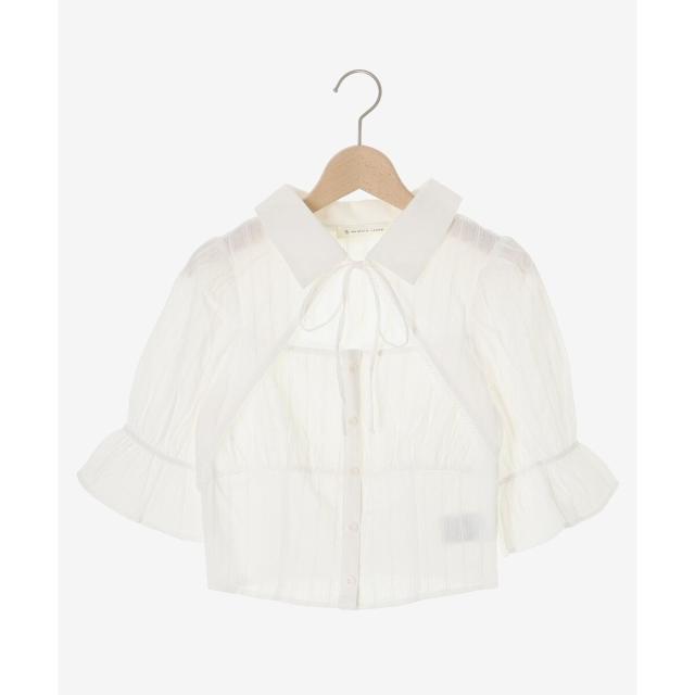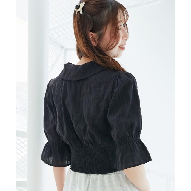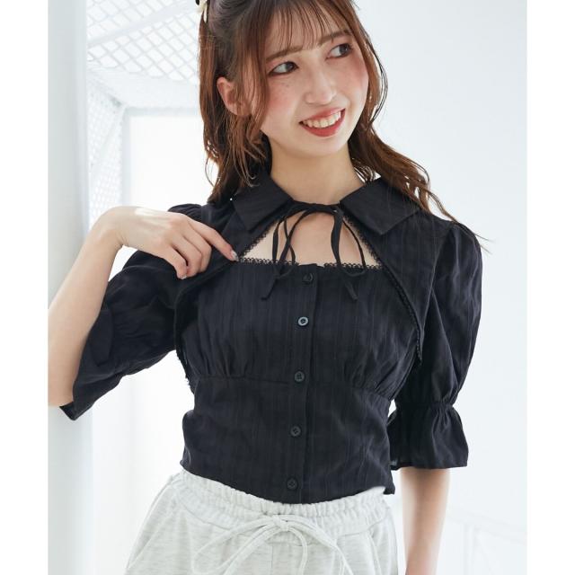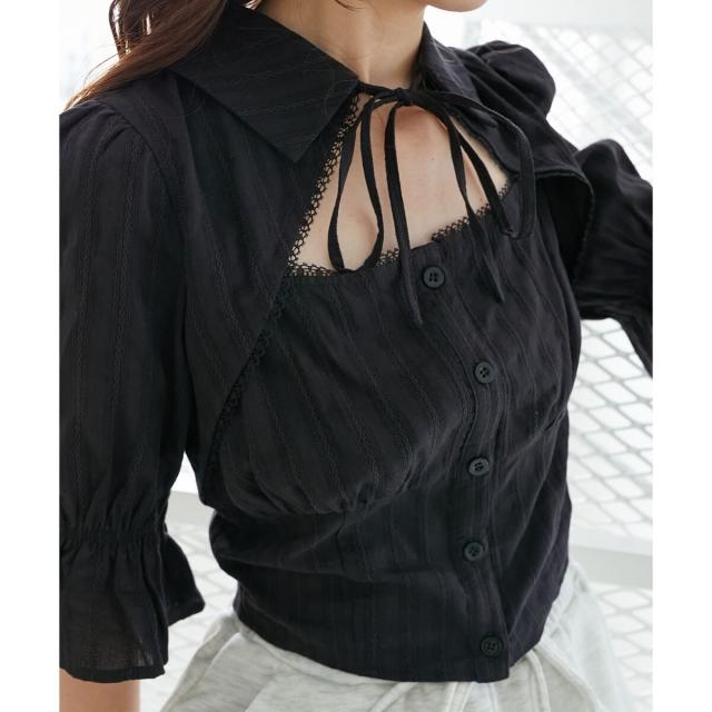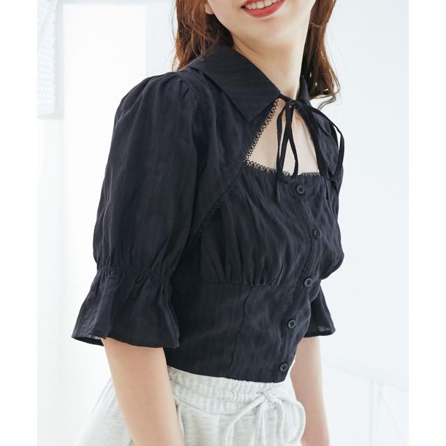 襟付きブラウスに肌みせデザインを加えて華やかに仕上げたブラウス。