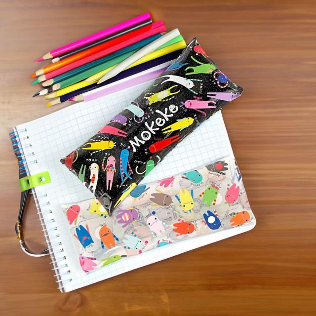 ラメがきらめく透明素材のボディに、モケケとチモッケ、全41種類の個性豊かなキャラクターたちが所狭しとデザインされた総柄パターンは、見ているだけで気分が明るくなる遊び心たっぷりの仕上がり。