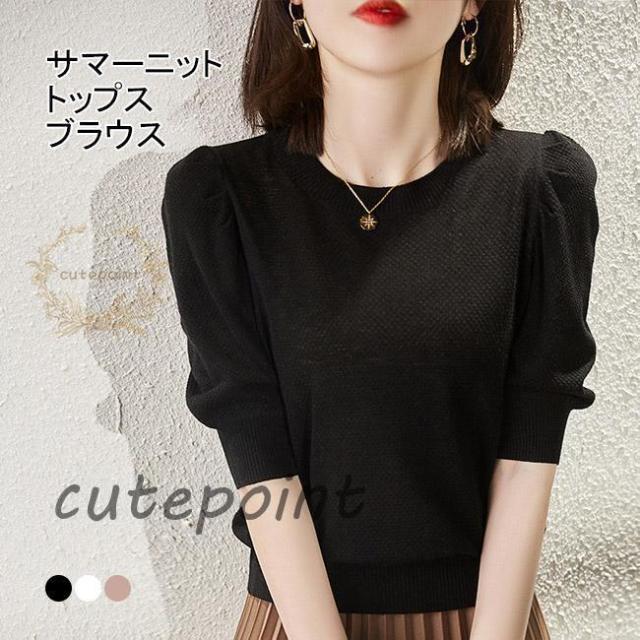 サマーニット レディース ニットトップス 半袖 リブニット 薄手ニット ニットセーター ストレッチ カジュアル トップス