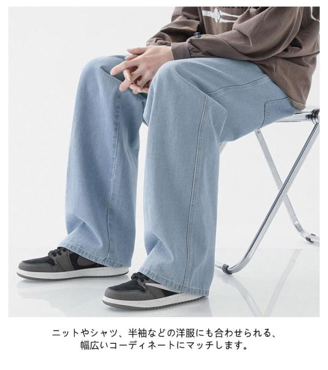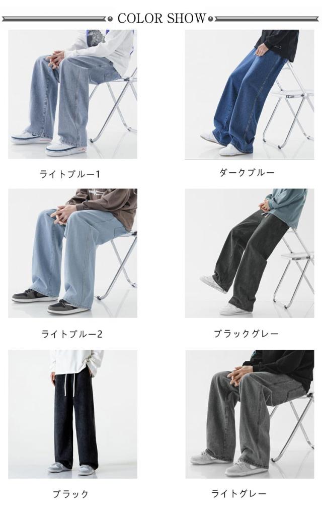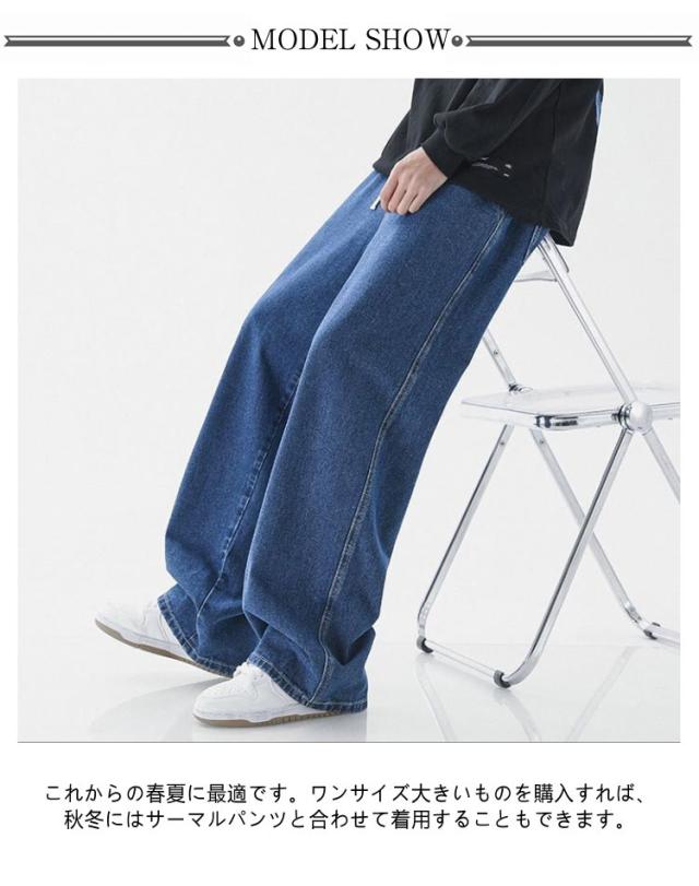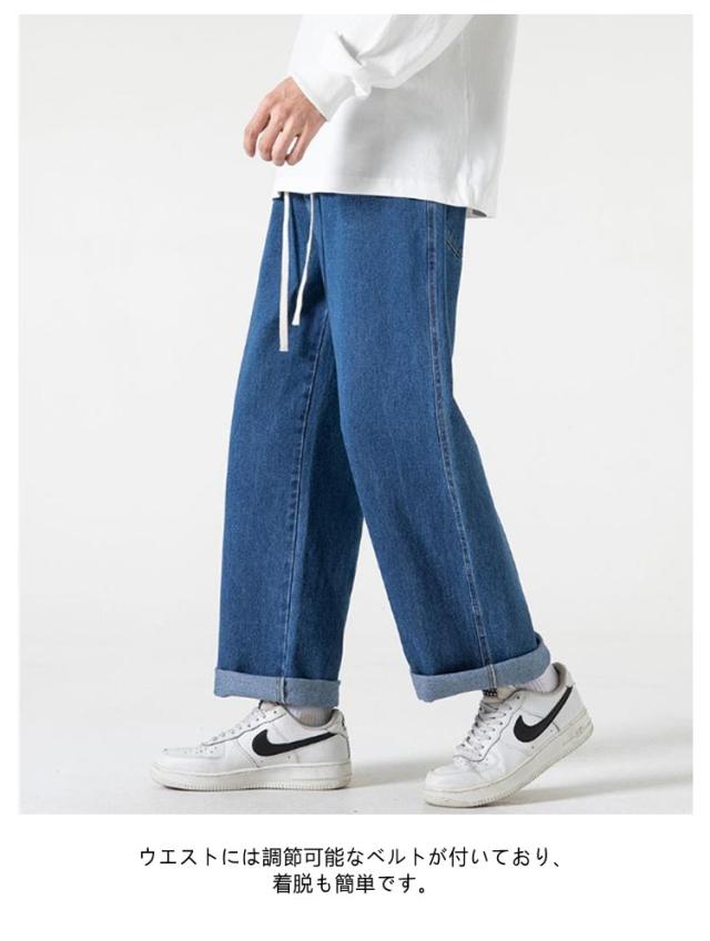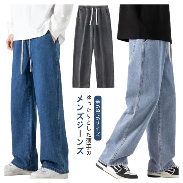 デニムパンツ ジーンズ メンズ ワイド デニム ズボン 薄手 ウエストゴム ウエスト紐付き 春 夏 ストレート カジュアル ワイドレッグ パンツ ズボン メンズ ロングパンツ 無地 送料無料 ブラック ライトブルー ダークブルー グレー