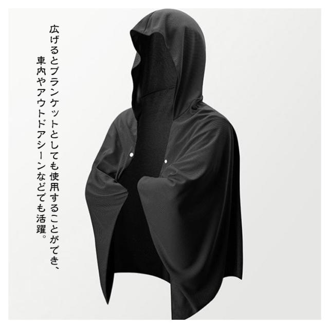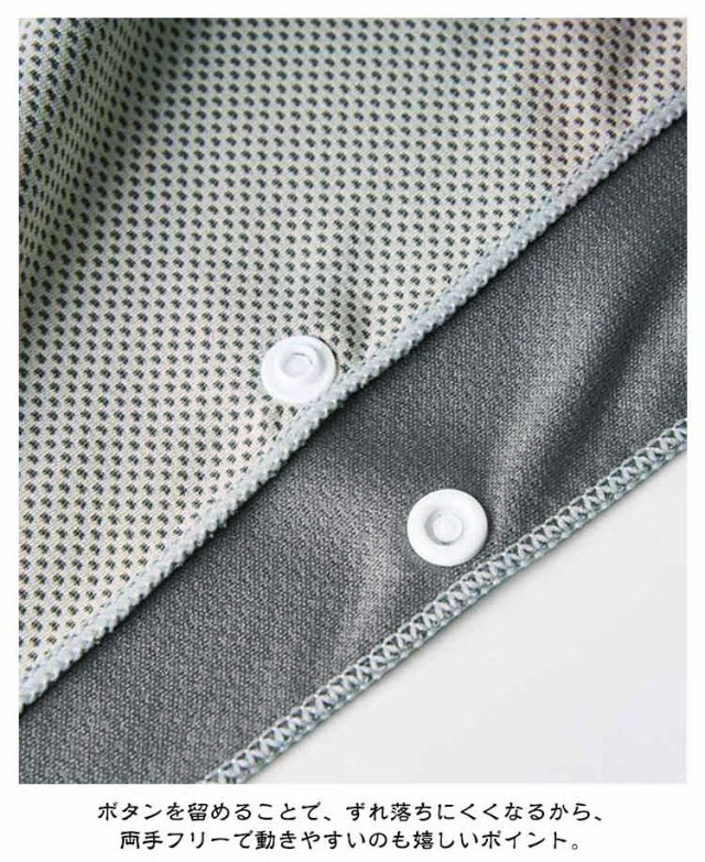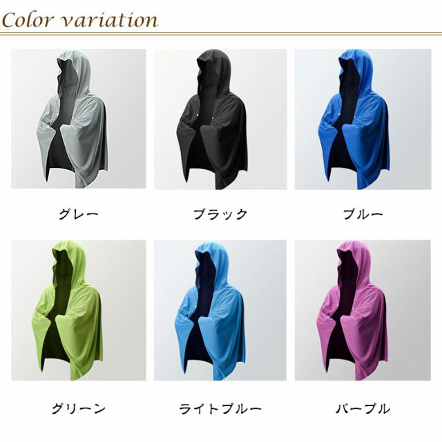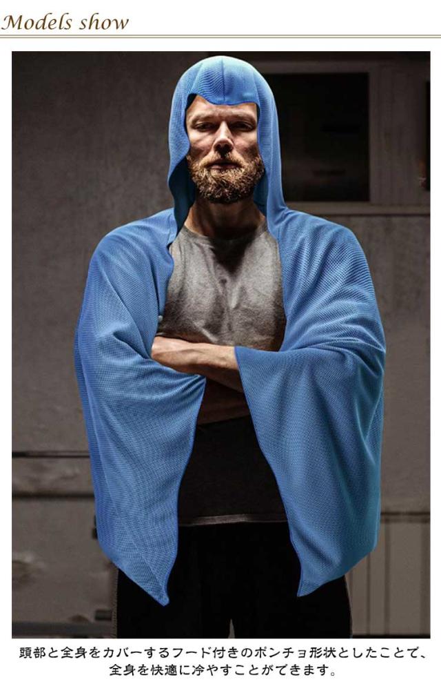 | 接触冷感で暑い時もひんやり!頭部と全身をカバーするフード付きのポンチョ形状としたことで、全身を快適に冷やすことができます。 暑さが気になる時にサッと着られるのがポイントです。 サラサラな肌触りで、肌に触れるとひんやり冷たい接触冷感の生地を使用したフード付きポンチョ。 ボタンを留めることで、ずれ落ちにくくなるから、両手フリーで動きやすいのも嬉しいポイント。 広げるとブランケットとしても使用することができ、車内やアウトドアシーンなどでも活躍。薄手だから、コンパクトにたたんで持ち運びも楽ちん。 | |