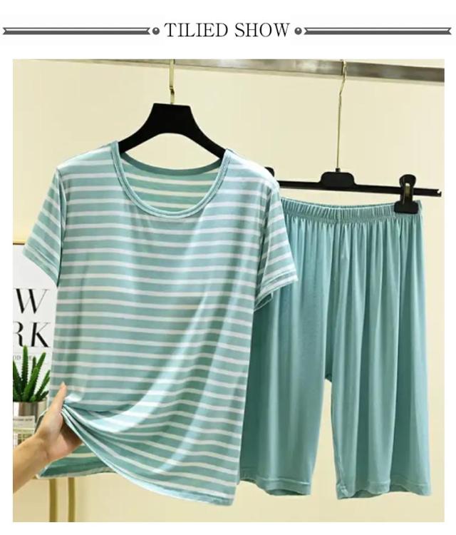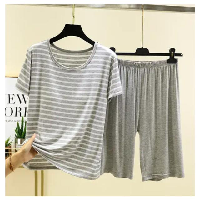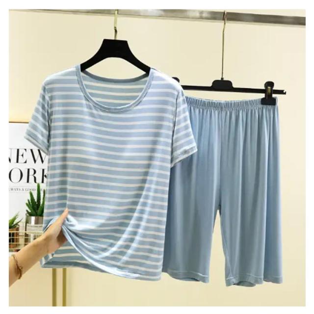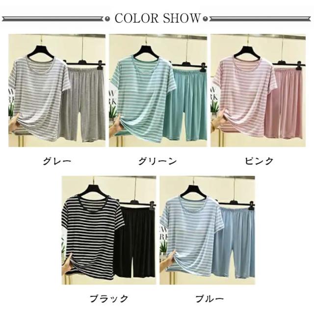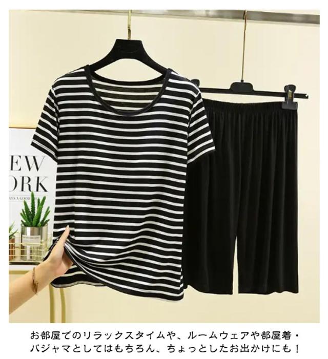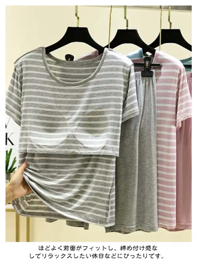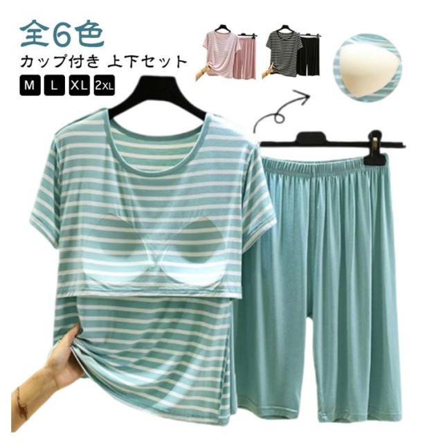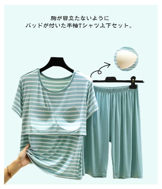 カップ付き Tシャツ 上下セット レディース ハーフパンツ ルームウェア 半袖Tシャツ 涼感 夏 薄手 ショートパンツ 涼しい 大きいサイズ ボーダー柄 部屋着 パジャマ 可愛い アンダーフリー ゴムなし 柔らかい 締め付けない ナイトウェア 快適