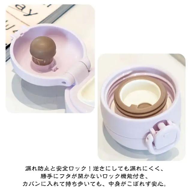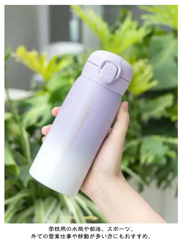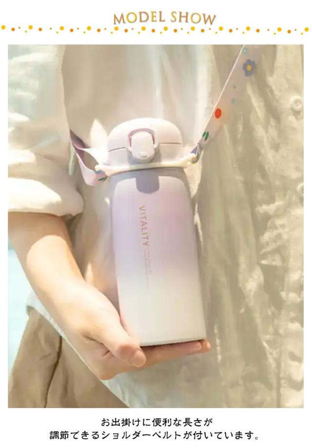 | 水筒 ストラップ付きです。 お出掛けに便利な長さが調節できるショルダーベルトが付いています。 真空2重構造で超軽量・コンパクト、スタイリッシュな 保冷ステンレスボトル。 学校用の水筒や部活、スポーツ、外での営業仕事や移動が多い方にもおすすめ。 ロックを解除し、ワンタッチオープンで簡単にふたを開けることができます。 底面部分は衝撃に強く、不意な落下にも安心です。 漏れ防止と安全ロック!逆さにしても漏れにくく、勝手にフタが開かないロック機能付き、カバンに入れて持ち歩いても、中身がこぼれず安心。 | |