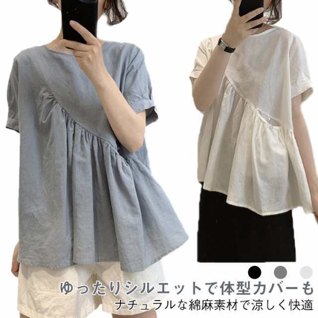 フレアシャツ レディース 大きいサイズ 綿麻素材 不規則裾 半袖 チュニック ゆったり ナチュラル トップス ブラウス 夏服 ラウンドネック 可愛い 送料無料