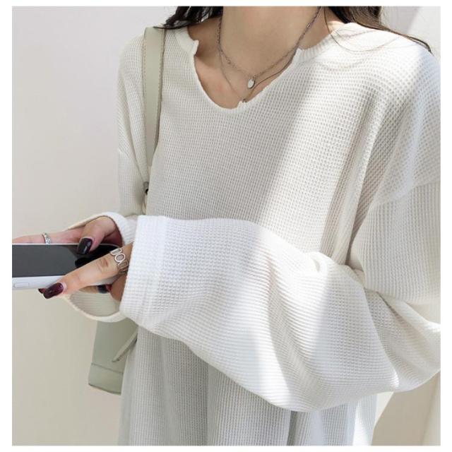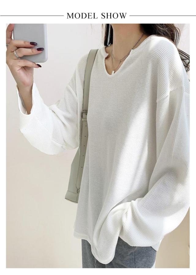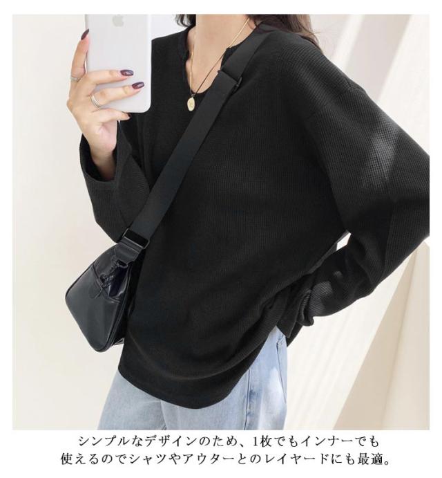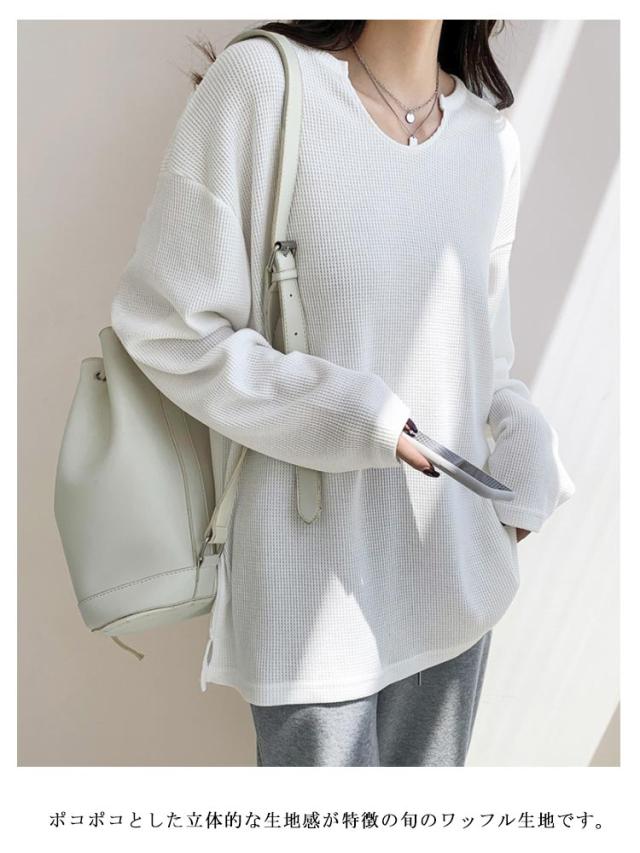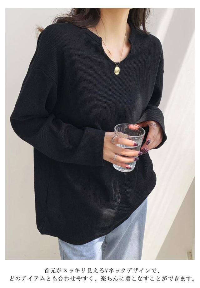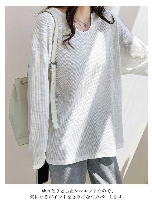 レディース Tシャツ 長袖 Vネック トップス カットソー 無地 ワッフル生地 ティーシャツ シンプル 可愛い ゆったり 大きいサイズ 体型カバー カジュアル 普段着 薄手 春秋 送料無料