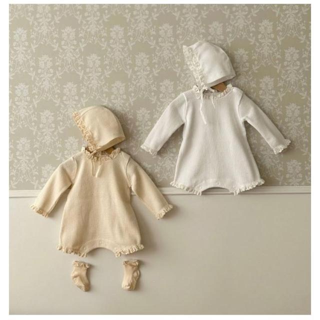 | ・肌触りの良いワッフル生地のボンネット付きベビーロンパース ・ボンネットや首元にあしらわれたコットンレースが可愛いポイント ボンネットはクラシカルヨーロッパ調。首の下でひもを結ぶタイプです。 ・新生児の退院着やお宮参りなどの写真撮影に大活躍です◎ | |