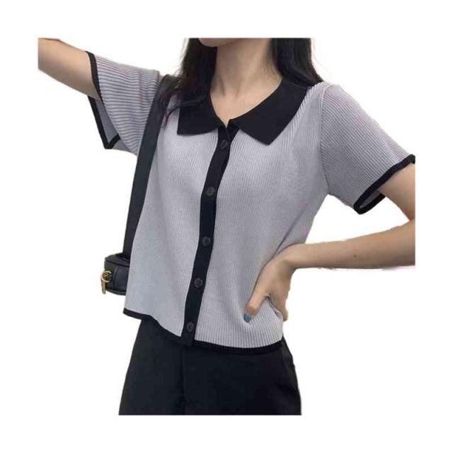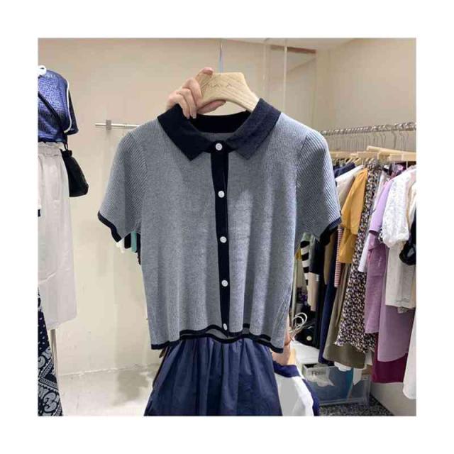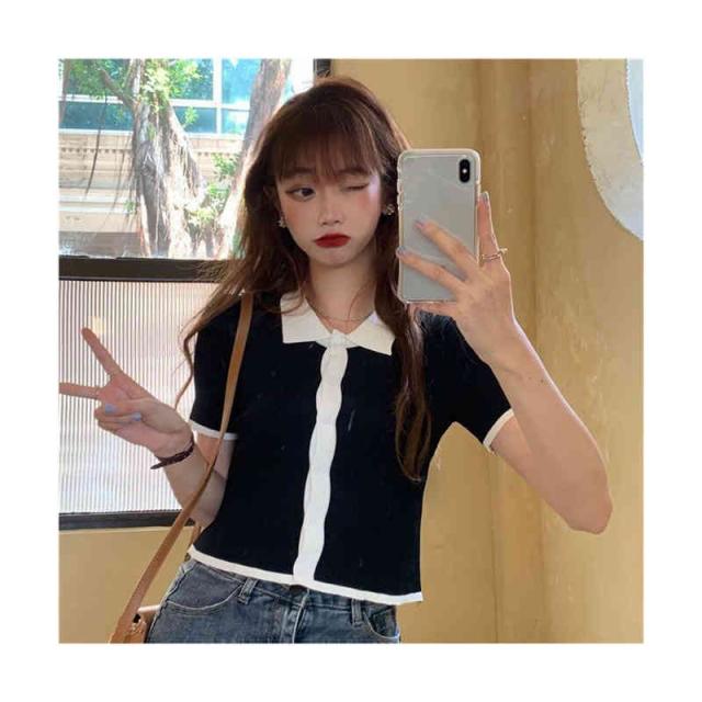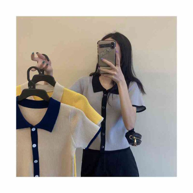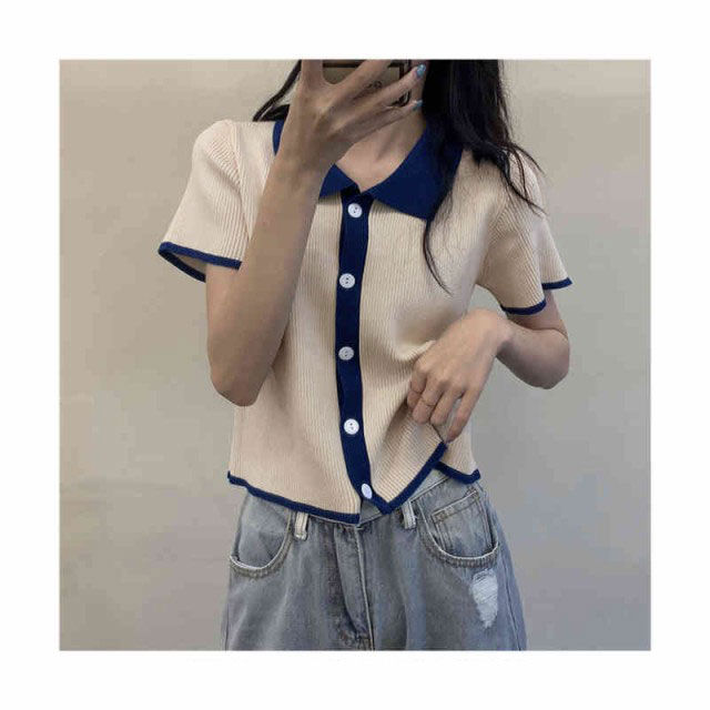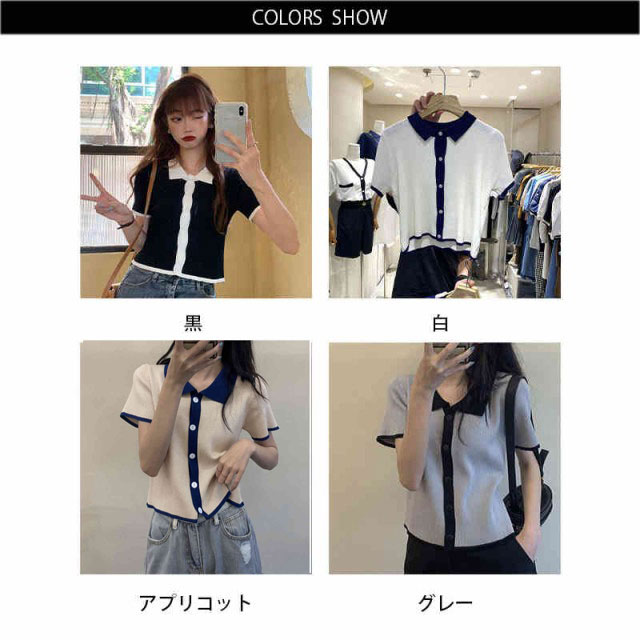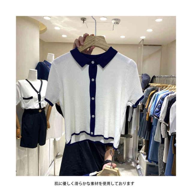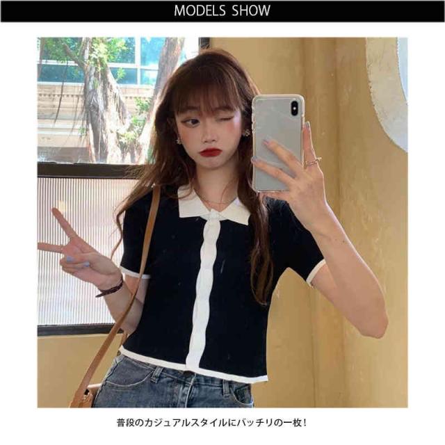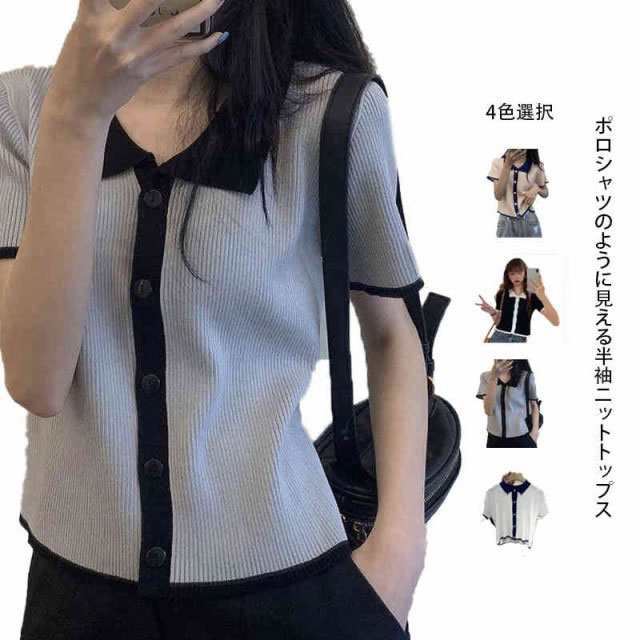 配色 サマーニット ニット ポロシャツ レディース 半袖 tシャツ 春 夏 トップス サマーニット オープンカラー 襟付き リブニット 配色 tシャツ 冷感 涼しい カットソー 大人 おしゃれ 韓国ファッション