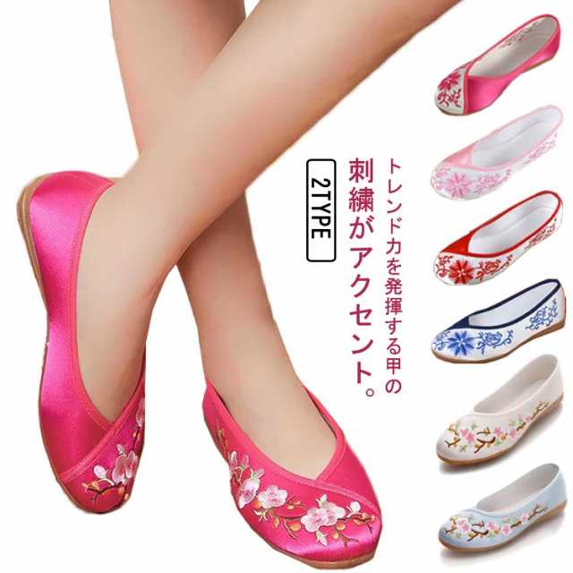 刺繍パンプス チャイナシューズ パンプス 刺繍シューズ 中華風 サテン 台湾シューズ 婦人靴 唐装 フラットパンプス ぺたんこ 歩きやすい チャイナ ローヒール 花柄刺繍 女性用 シューズ 北京布靴 /民族風 コスプレ