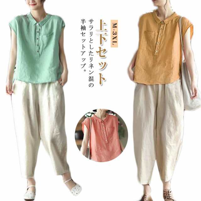 レディース 夏 麻 40代 リネン ブラウス シャツ ワイドパンツ セットアップ 夏用 カジュアル リネンパンツ パンツ お洒落 トップス 半袖 上下セット 綿 イージーパンツ ウエストゴム きれいめ 涼しい 部屋着 リネン ゆったり 体型カバー 無地