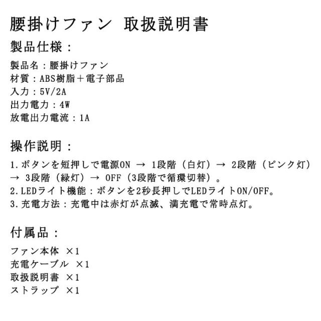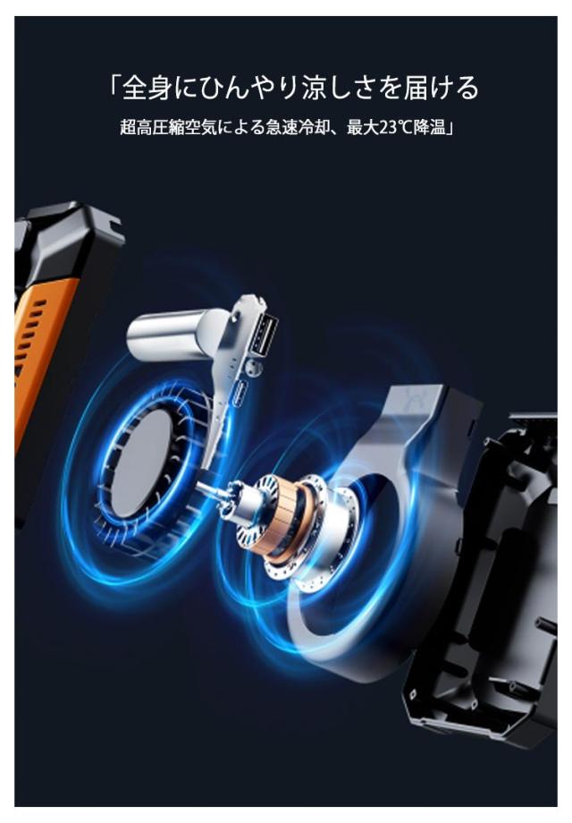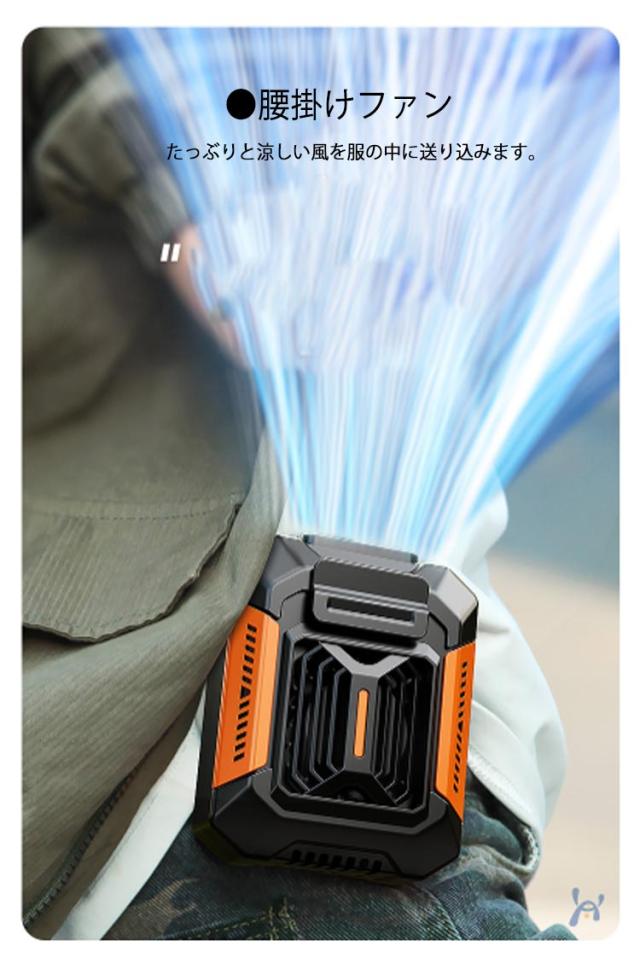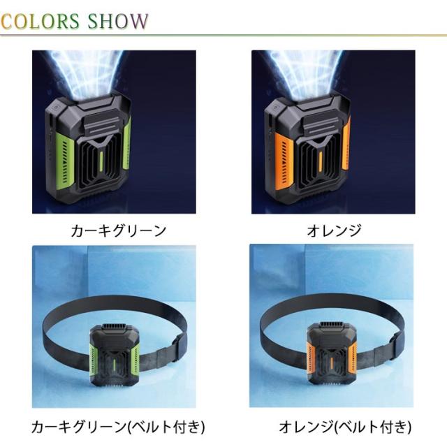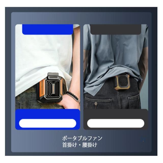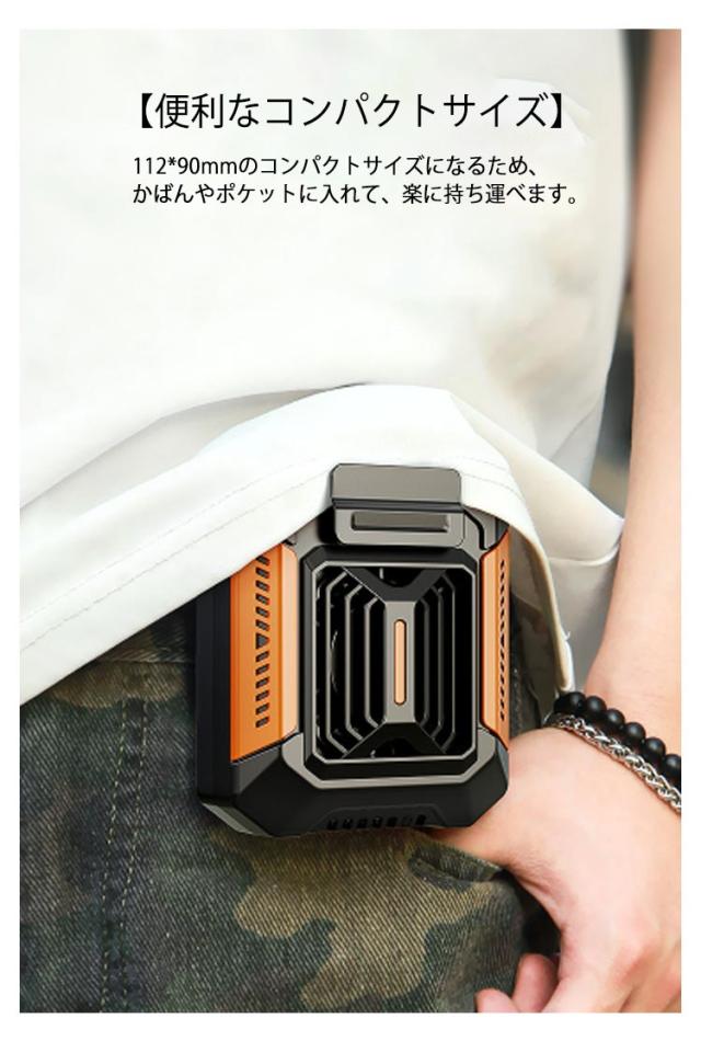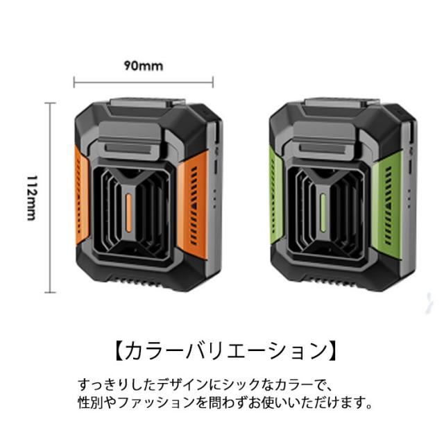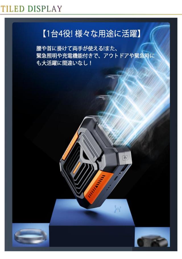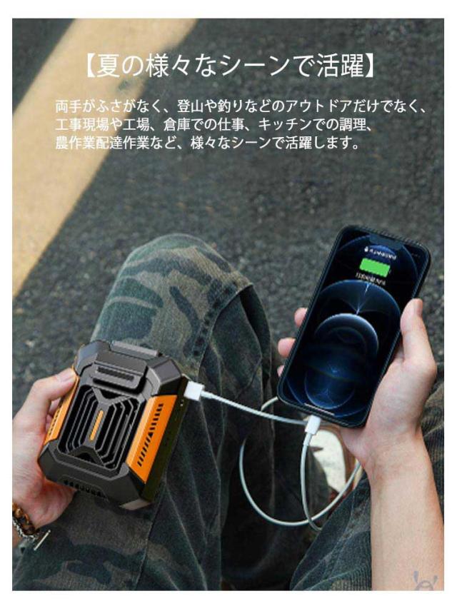 | 風量3段階調節・LED懐中電灯・モバイル電源・4000mAh大容量 ポータブルファン 首掛け・腰掛け 【1台4役! 様々な用途に活躍】 腰や首に掛けて両手が使える!また、緊急照明や充電機能付きで、アウトドアや緊急時にも大活躍に間違いなし! ●首掛けファン 両手をふさがず、快適な風を感じます。 ●腰掛けファン たっぶりと涼しい風を服の中に送り込みます。 ●ランタン・懷中電灯 停電時や災害時、暗い夜道を歩く際には非常に便利です。 ● としてスマホやワイヤレスイヤホンなどUSBデバイスに充電可能。 【小さくてもパワフル送風】 強力なブラシレスモーターを使用で低騒音、コンパクト、回転速度が高い省エネ性も優れています。 【独自な強力送風設計】 シロッコファンと螺旋状の送風管設計で、より安定性があり、より均一で密度の高い空気の流れを作り出すととに成功しました。 14,000回転/分の超高速モーターで全身を冷風カバー 即席エアコン服 超高圧縮空気による急速冷却、最大23℃降温」 「全身にひんやり涼しさを届ける 【ボタン1つで風量調節!】 強・中・弱の3段階に風量を調整することがボタンーつで出来ます。 【使い方いろいろ!】 便利なクリップであらゆる部位に設置可能手を塞ぐ事なく涼しい風を満喫できます。 付属のストラップをつけば首にも引っ掛けられるので両手が解放され、使い勝手は良い。 【停電時や災害時に活躍】 照明と機能搭載 ●ナイトライト 災害や停電時など緊急照明として様々なシーンで活躍します。 ● USB出カコネクターでほとんどのスマホやタブレットのデバイスに充電可能。 【便利なコンパクトサイズ】 112*90mmのコンパクトサイズになるため、かばんやポケットに入れて、楽に持ち運べます。 【タフなアウトドア仕様】 外殻はABS樹脂を使用しており、様々なアウトドアもサポートできるよう、タフな環境にも対応する強靱なボディを持ちます。 【夏の様々なシーンで活躍】 両手がふさがなく、登山や釣りなどのアウトドアだけでなく、工事現場や工場、倉庫での仕事、キッチンでの調理、農作業配達作業など、様々なシーンで活躍します。 【カラーバリエーション】 すっきりしたデザインにシックなカラーで、性別やファッションを問わずお使いいただけます。 | |