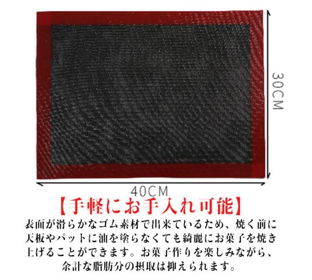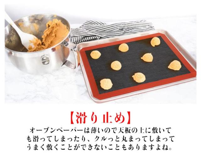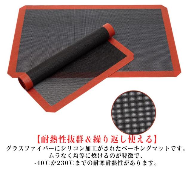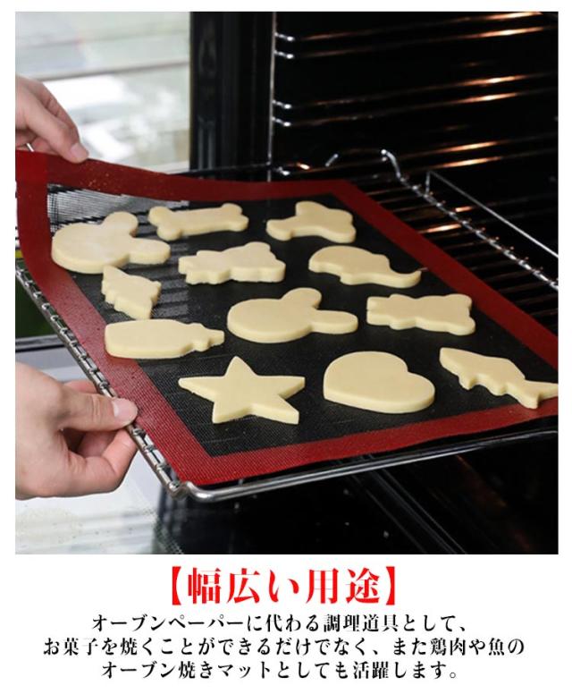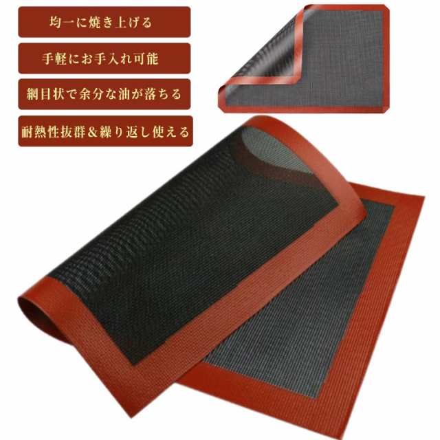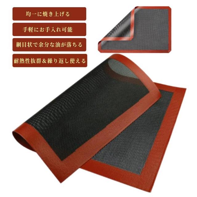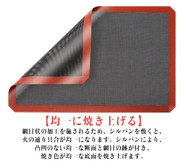 | 【耐熱性抜群&繰り返し使える】グラスファイバーにシリコン加工がされたベーキングマットです。ムラなく均等に焼けるのが特徴で、-40℃か230℃までの耐寒耐熱性があります。 耐久性も抜群で半永久的にご使用いただけます。オーブンペーパーよりも経済的です! 【均一に焼き上げる】網目状の加工を施されるため、シルパンを敷くと、火の通り具合が均一になります。シルパンにより、凸凹のない均一な断面と網目の跡が付き、焼き色が均一な底面を焼き上げます。 【網目状で余分な油が落ちる】シルパンを使って焼くと網目状の加工により、余分な油脂や水分が抜けサクサクに焼けると同時に生地が浮くことなく、滑らかな焼き上がりになります。より健康、より美味しいクッキーが楽しめます。 【手軽にお手入れ可能】表面が滑らかなゴム素材で出来ているため、焼く前に天板やパットに油を塗らなくても綺麗にお菓子を焼き上げることができます。お菓子作りを楽しみながら、余計な脂肪分の摂取は抑えられます。 【滑り止め】オーブンペーパーは薄いので天板の上に敷いても滑ってしまったり、クルっと丸まってしまってうまく敷くことができないこともありますよね。 【デザインにこだわる優れ物】表面がメッシュのようなデザインなので、通気性抜群で余分な油や水分が落ち、熱が均一に伝わりやすいです。綺麗にお菓子を焼けます。 【柔らかく収納に便利】シリコン製で柔軟性が高いため、使用しない時にはクルっと巻いて簡単に収納できる大変便利なアイテムです。 【幅広い用途】オーブンペーパーに代わる調理道具として、お菓子を焼くことができるだけでなく、また鶏肉や魚のオーブン焼きマットとしても活躍します。 | |