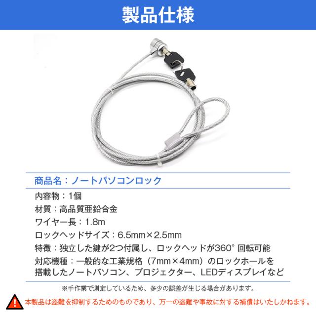 セキュリティワイヤー 1個 1.8m 鍵 ロック PC ノートパソコン ワイヤーロック 盗難防止 情報漏洩防止 7×4mm スロット対応 180cm 頑丈 オフィス カフェ 簡単設置