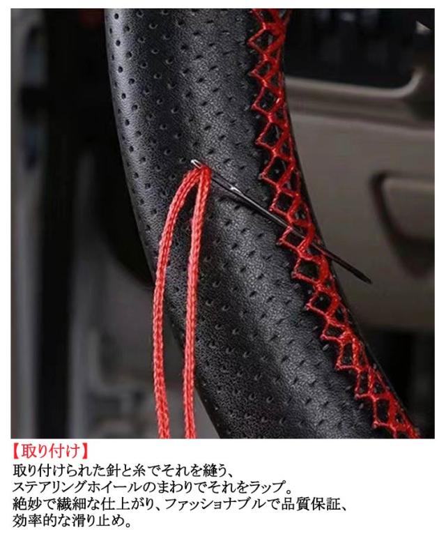 | 【直径38cm】 【材質】本革の素材を使用しているので、変な匂いがしなく、柔らかくて、握るときにしっかり手になじみます。グリップ感が抜群です。滑り止めの効果もある。 【高い耐久性】編まれたステアリングホイールカバーの接合部はしっかりとしっかりしていて、革素材はそれをより柔軟にし、長期間使用することができます。 【編み込み式ハンドルカバーの特長】取り付け後にカバーに隙間ができないので指が引っかかったり違和感がない。ホコリなどの汚れが隙間に入り込まないので衛生的。太くなり過ぎないので運転していても疲れにくい。 ウレタンハンドルと違い、冬は冷たくない、夏は触れない程熱くない。ハンドル、ハンドルカバーの劣化を防げる。 【取り付け】取り付けられた針と糸でそれを縫う、ステアリングホイールのまわりでそれをラップ。絶妙で繊細な仕上がり、ファッショナブルで品質保証、効率的な滑り止め。 【内容と適応車種】ハンドルカバー、糸、針、適応外直径が36.5-37.9cmまでです。編み式ハンドルカバーは丸型ハンドルに、トヨタ、ホンダ、ニッサン、マツダ、ダイハツ、スバル、スズキ、乗用車、軽自動車など様々な車種に適応します。ご車のハンドルサイズを測って、ご確認の上ご購入ください。 | |