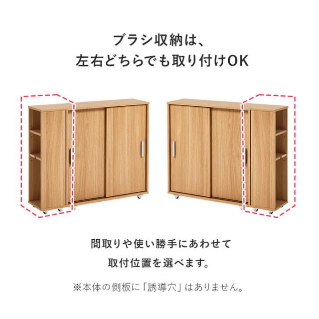 引き戸タイプなので省スペースなのに、大きめのペーパーロールも入る収納力。お掃除ブラシが収納できるサイドラックとキャスター付き