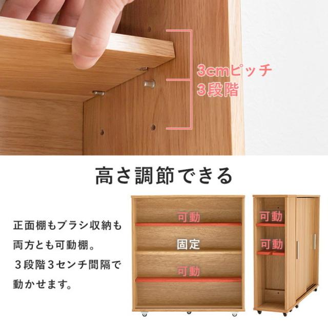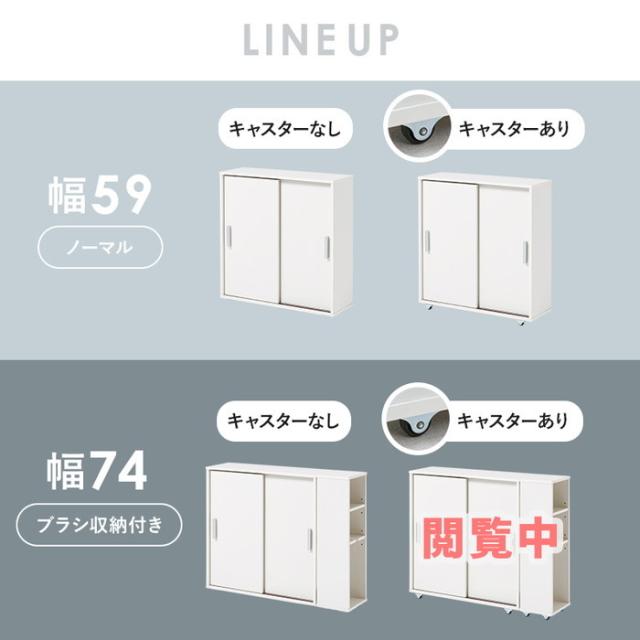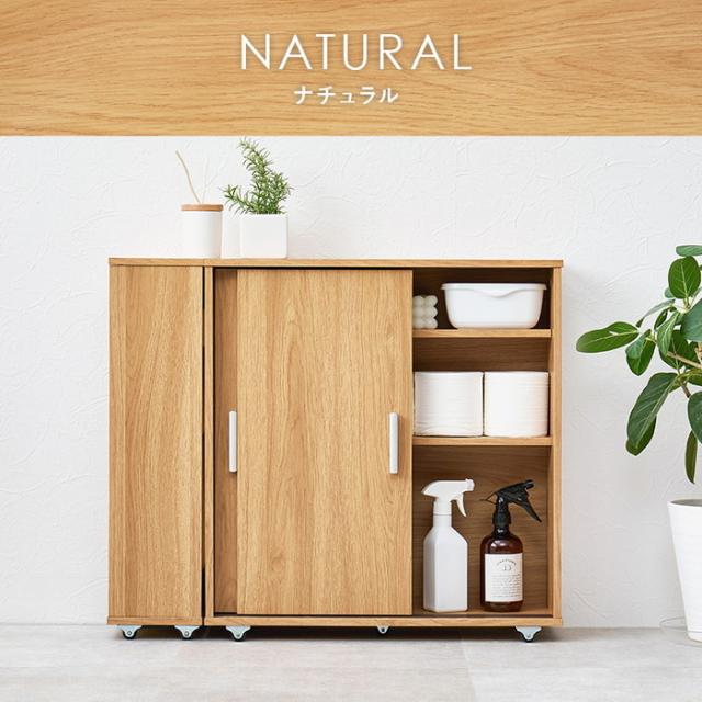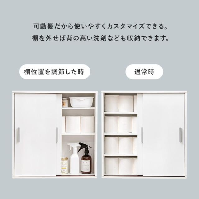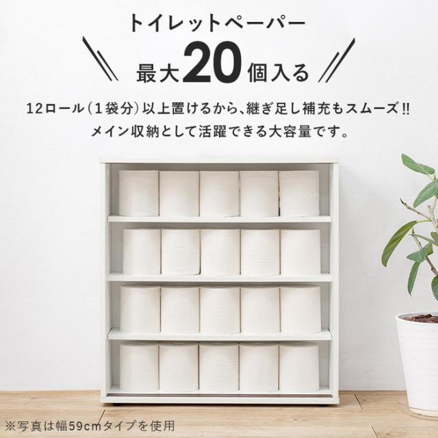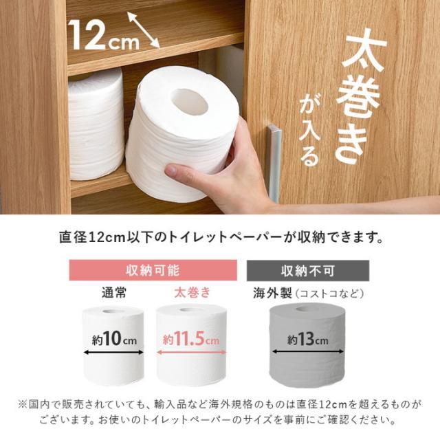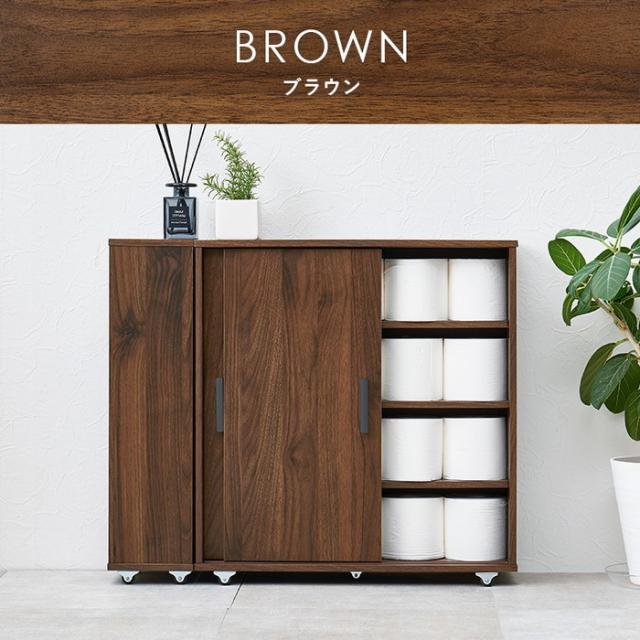 | 商品説明 | 引き戸タイプなので省スペースなのに、大きめのペーパーロールも入る収納力。お掃除ブラシが収納できるサイドラックとキャスター付き |