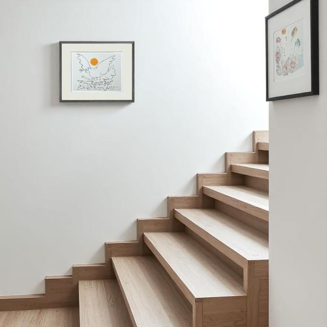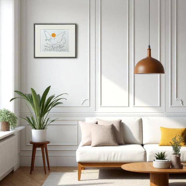 鳩とオレンジの太陽が静かに語りかける名画を、温もりある木製フレームで丁寧に仕上げました。