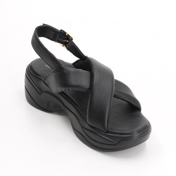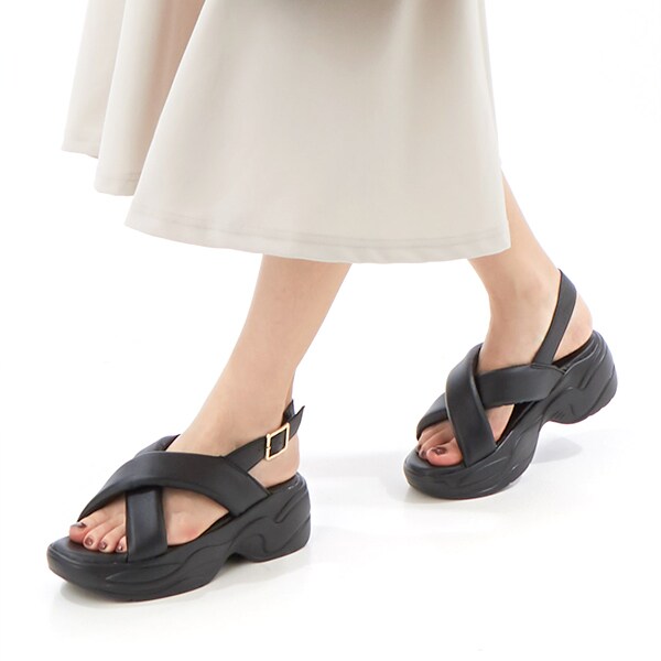 トレンドのパデッド厚底デザインながら、ダブルクロスベルトと足首のストラップで