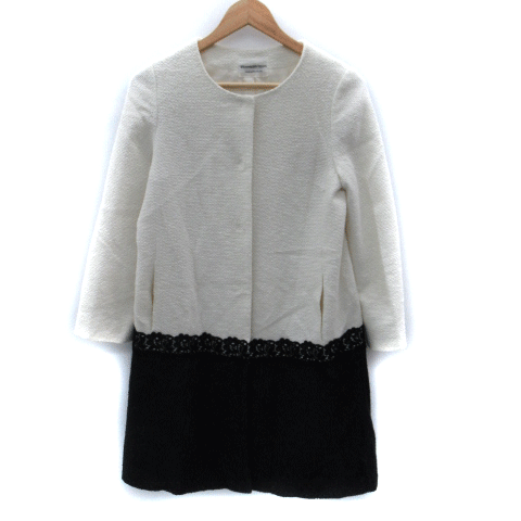 【中古】ストロベリーフィールズ ノーカラーコート ロング丈 ツイード 刺繍 レース ラメ 白 ホワイト 紺 ネイビー