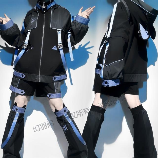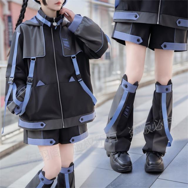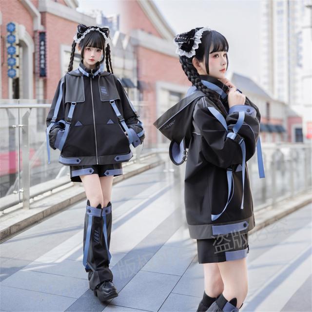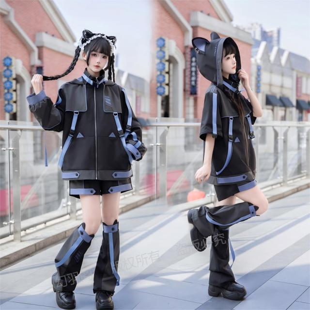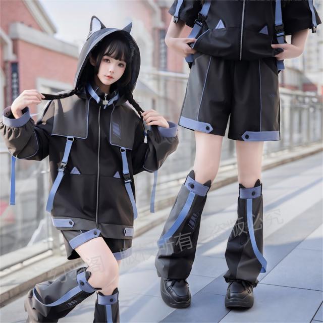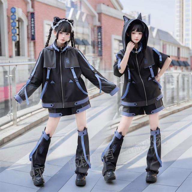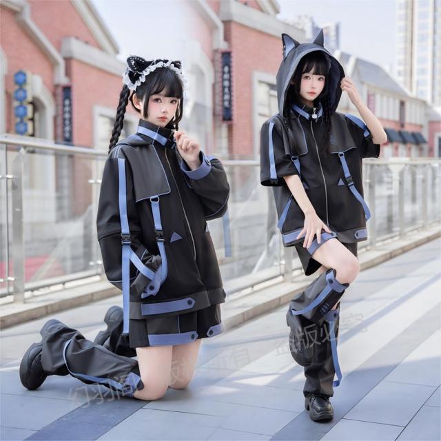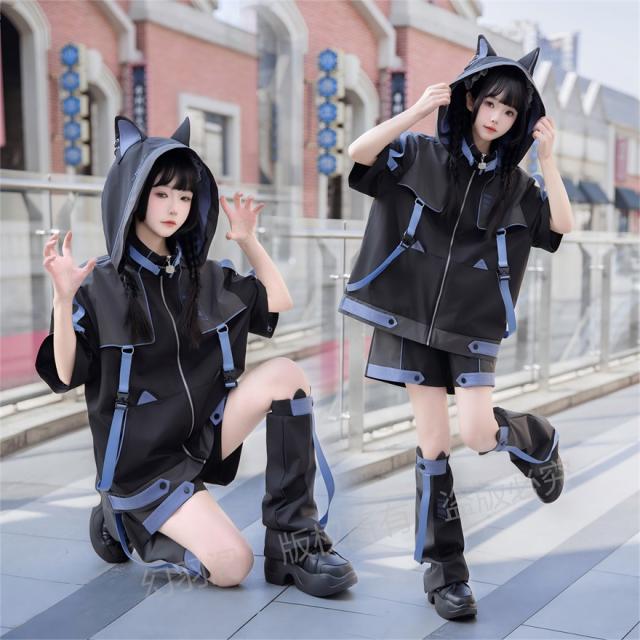 ちょっぴりダークでミステリアスな魅力が詰まった、猫耳フード付きジャケット、ショートパンツ、レッグウォーマーの3点セットです。