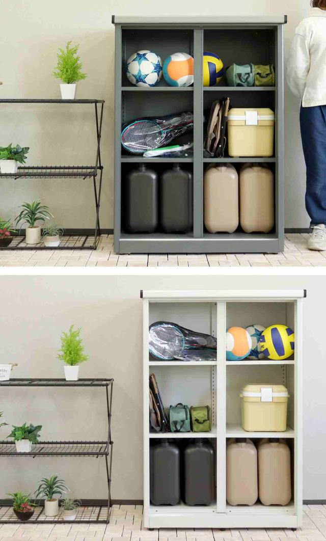 縦長タイプの物置です。中央に仕切りがあり、左右で分割して棚板の高さを調整できます。大きなゴルフバッグやベビーカー、お子様の遊具などすっきり収納できます。