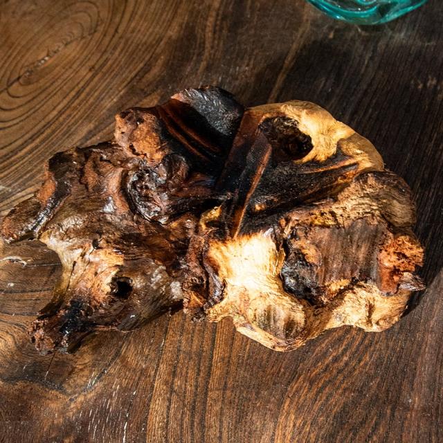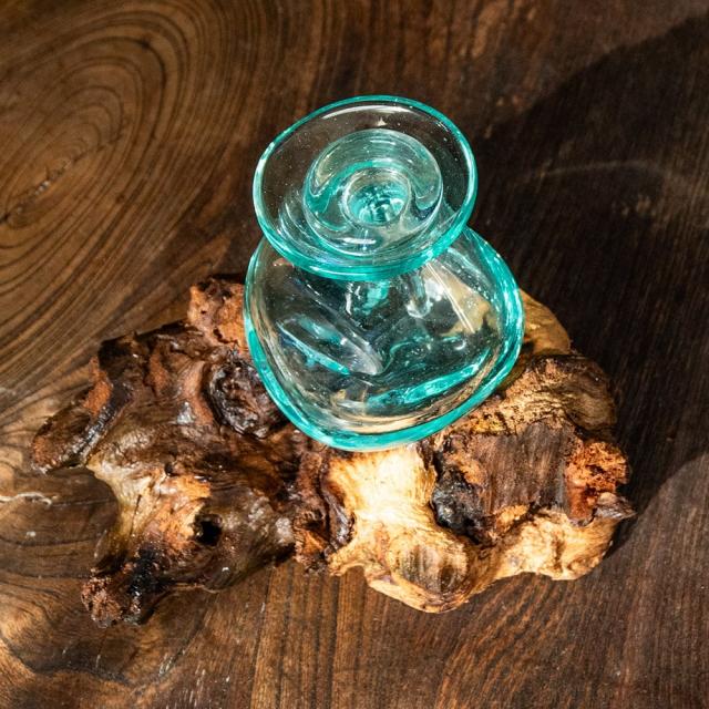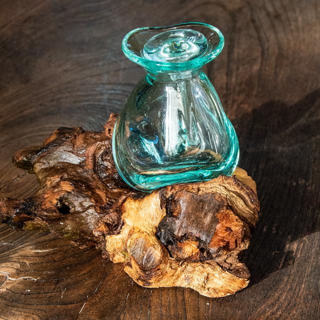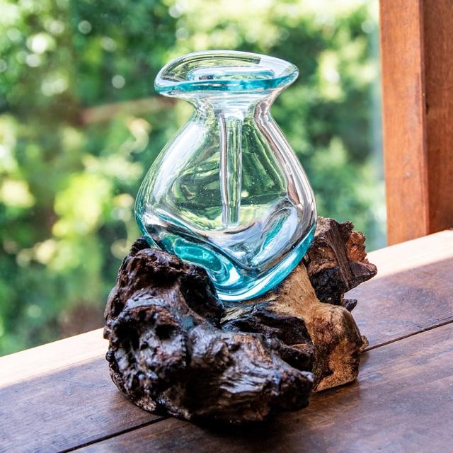 インドネシア・バリ島の工房で生まれた、天然木とリサイクルガラスのインテリア雑貨です。職人が回収されたガラス瓶を高温で溶かし、自然の形を残した木の土台に流し込むことで、一つひとつ異なる表情を持つ器が生まれます。冷めるとガラスが木のくぼみにぴたりと固まり、まるで自然がつくり出したアートのようです。使用されるのは、風や雨にさらされて時を刻んだ天然木。どれも形・質感・色合いが異なり、その木のくぼみや傾斜に合わせて、溶けたガラスが自由に広がり固まっていきます。そのため完成するフラワーベースは、ガラスと木がぴたりと寄り添った、まさに世界にひとつだけの造形作品。同じものは二つと存在せず、ひとつひとつが「自然と職人の共同制作」とも言える唯一無二の組み合わせです。