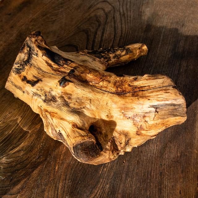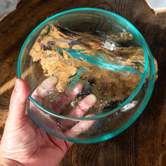 高温で熱せられた吹きガラスは古木に流し込まれ、それにより独特のフォルムが形作られるのです。