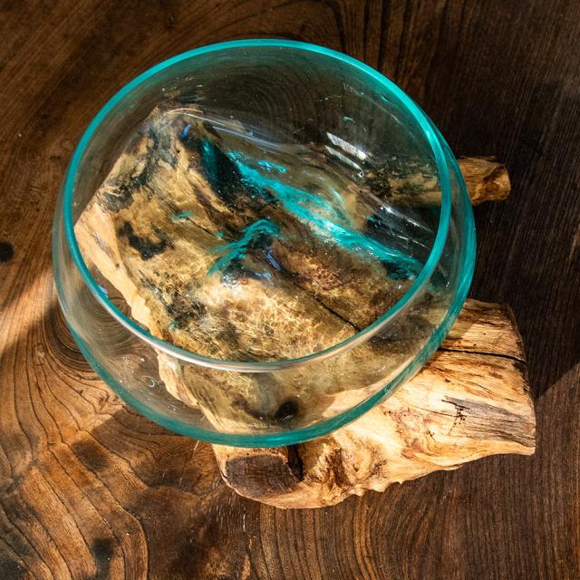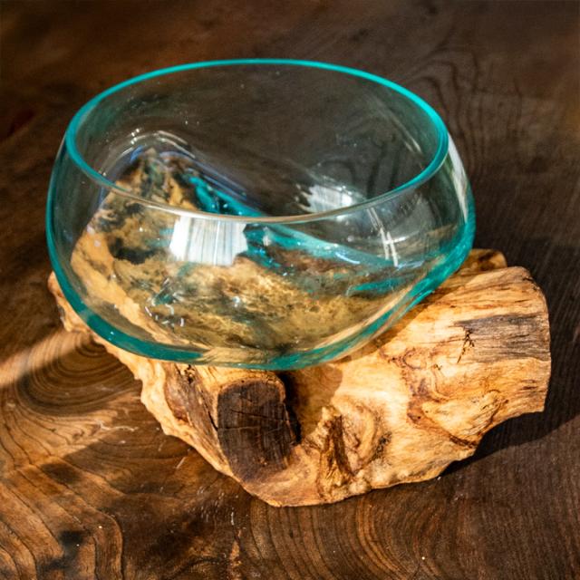 インドネシア・バリ島の工房で生まれた、天然木とリサイクルガラスのインテリア雑貨です。職人が回収されたガラス瓶を高温で溶かし、自然の形を残した木の土台に流し込むことで、一つひとつ異なる表情を持つ器が生まれます。冷めるとガラスが木のくぼみにぴたりと固まり、まるで自然がつくり出したアートのようです。使用されるのは、風や雨にさらされて時を刻んだ天然木。どれも形・質感・色合いが異なり、その木のくぼみや傾斜に合わせて、溶けたガラスが自由に広がり固まっていきます。そのため完成するフラワーベースは、ガラスと木がぴたりと寄り添った、まさに世界にひとつだけの造形作品。同じものは二つと存在せず、ひとつひとつが「自然と職人の共同制作」とも言える唯一無二の組み合わせです。