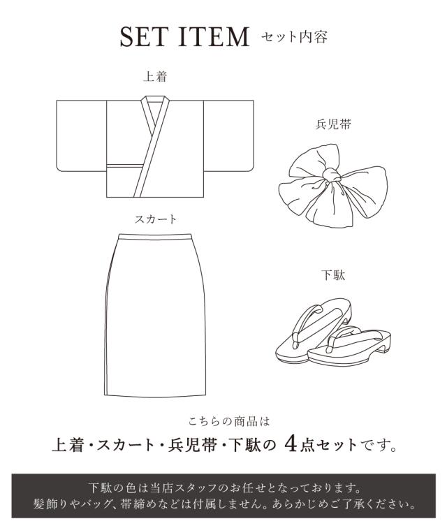 ※【二部式浴衣(上着+スカート)・帯・下駄】の3点セットです。セット内容の一部変更や、それに伴う値引きは承っておりません。
