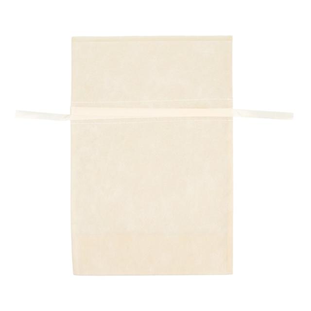 不織布を2層に重ねたギフト巾着袋です。両脇のリボンを引っ張って結ぶだけの簡単ラッピング。ベースのアイボリー色の上に薄手の白を重ねることで、やさしく上品なイメージのギフトに仕上がります。底にマチがあって広がるので、見た目よりも容量があります。