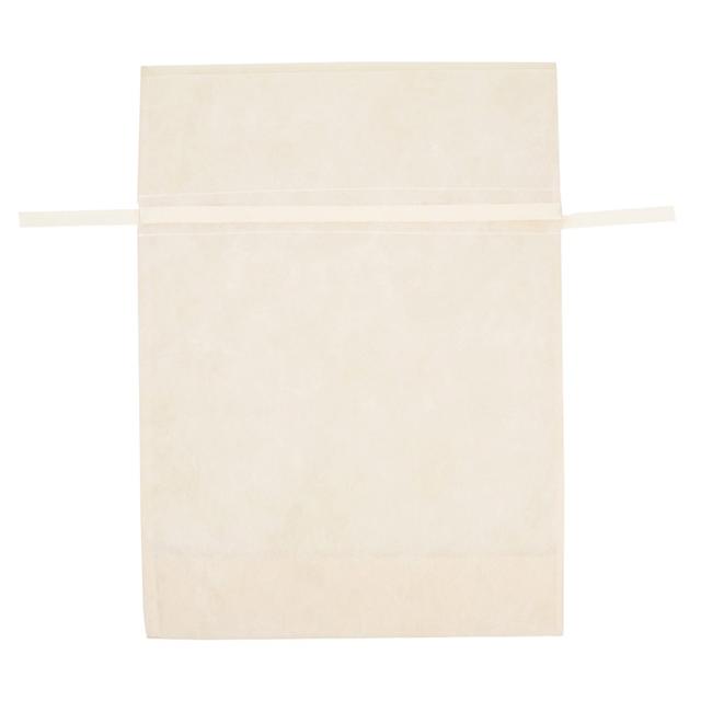不織布を2層に重ねたギフト巾着袋です。両脇のリボンを引っ張って結ぶだけの簡単ラッピング。ベースのアイボリー色の上に薄手の白を重ねることで、やさしく上品なイメージのギフトに仕上がります。底にマチがあって広がるので、見た目よりも容量があります。