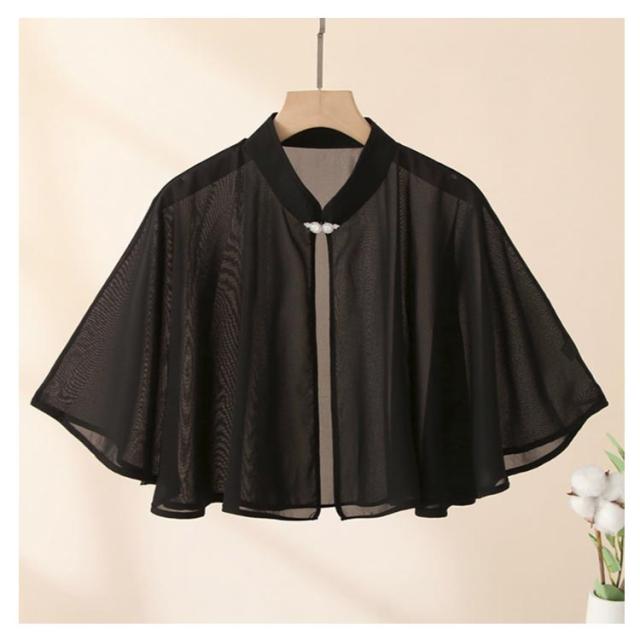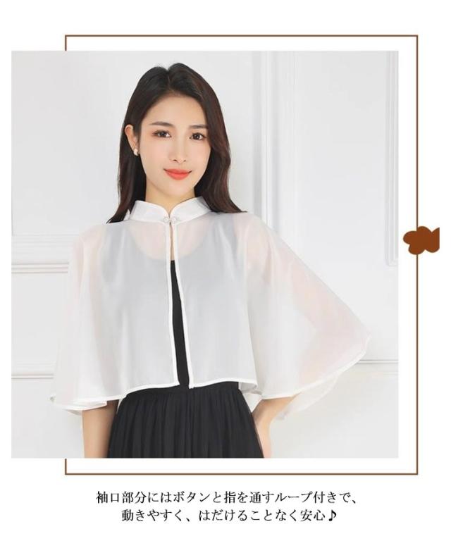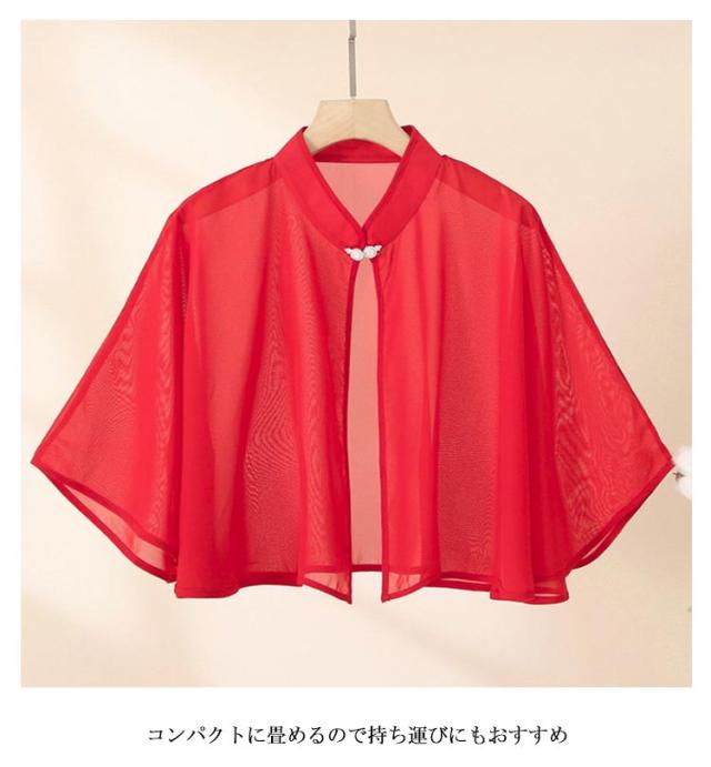 | 透け感がこなれた華やかなポンチョ スタンドカラーでエレガントな雰囲気を演出しながら、 シアー素材で軽やかさをプラス 首元のボタンを一つかけるだけの簡単装着 袖口部分にはボタンと指を通すループ付きで、 動きやすく、はだけることなく安心♪ 紫外線対策や冷房対策にも役立ちます◎ コンパクトに畳めるので持ち運びにもおすすめ | |
