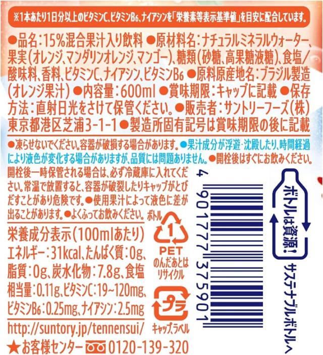 サントリー 天然水 きりっと果実オレンジ&マンゴー 600ml ペット 24本入り 1ケース 送料無料!!(北海道別途700円、沖縄県配送不可)