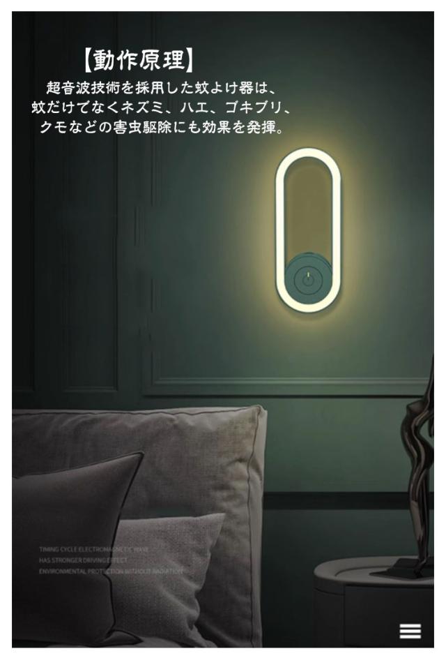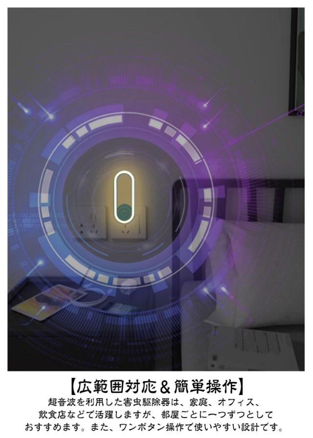 | 超音蚊駆除器 【動作原理】超音波技術を採用した蚊よけ器は、蚊だけでなくネズミ、ハエ、ゴキブリ、クモなどの害虫駆除にも効果を発揮。 【安全&環境に優しい】無放射の害虫駆除器は、化学物質や薬品を使用せず、呼吸磁気波を利用。人体や環境に配慮し、お子様やペットがいる家庭でも安心してご利用いただけます。ただし、音波に敏感な方やペットに異変が見られた場合はご利用をお控えください。 【広範囲対応&簡単操作】超音波を利用した害虫駆除器は、家庭、オフィス、飲食店などで活躍しますが、部屋ごとに一つずつとしておすすめます。また、ワンボタン操作で使いやすい設計です。 【省エネ&持続可能】コンセントに差し込むだけで簡単に使用できる害虫駆除器は、24時間稼働しても電気代がほとんどかからず、省エネで環境に優しいです。 【LEDライト付き】この害虫駆除機には、LEDライトが搭載されております。夜間や暗い場所での使用もできます。ご注意:この小型蚊よけ器は、稀に秒針のような音を発することがあります。音に敏感な方はご注意ください。 | |
