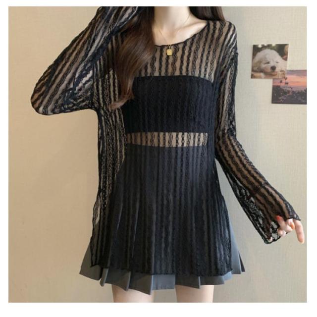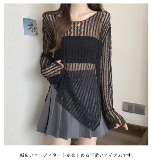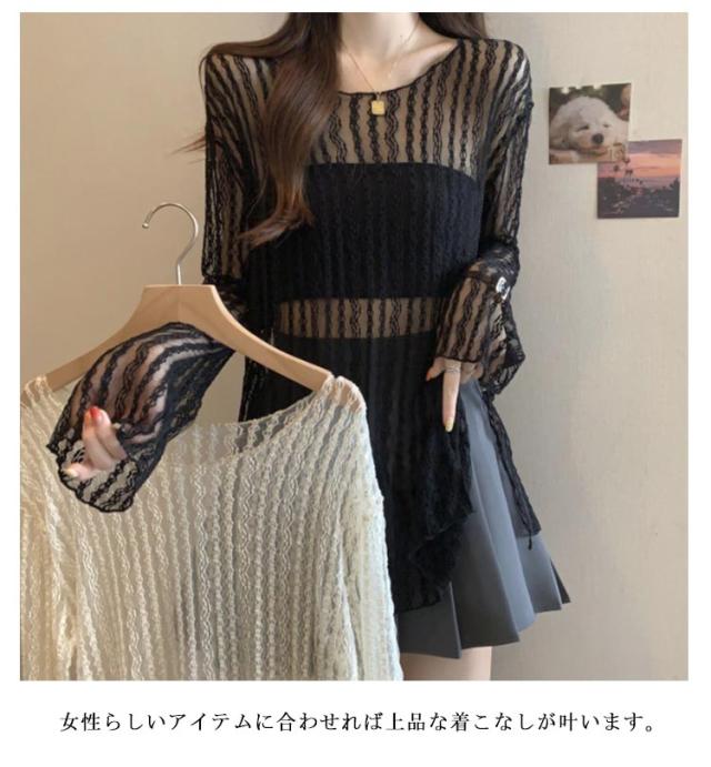 レース シアートップス レディース 長袖 Tシャツ 接触冷感 レーストップス ロングTシャツ フェミニン セクシー おしゃれ シアー トップス 透け感 肌見せ 薄手 春夏 重ね着 レイヤード スリット入り かわいい 涼しい M L XL 2XL 3XL 4XL