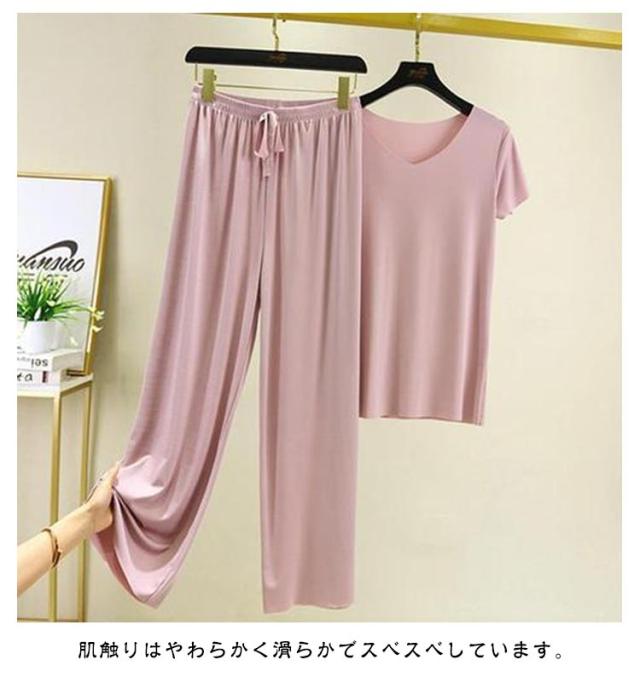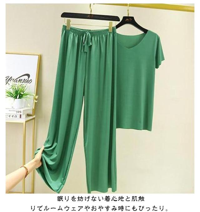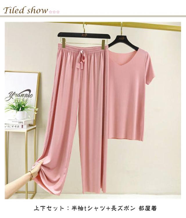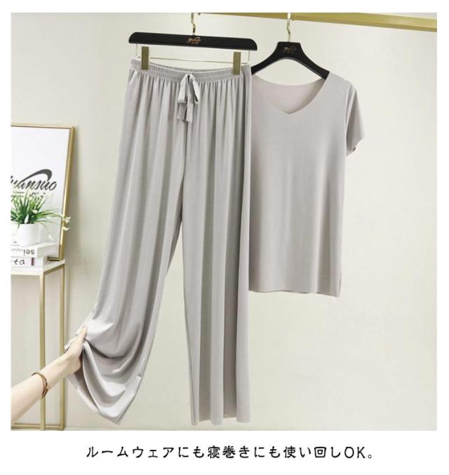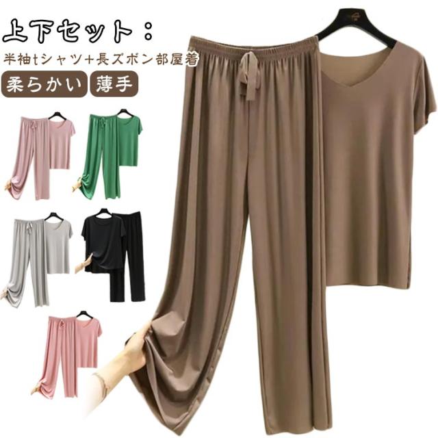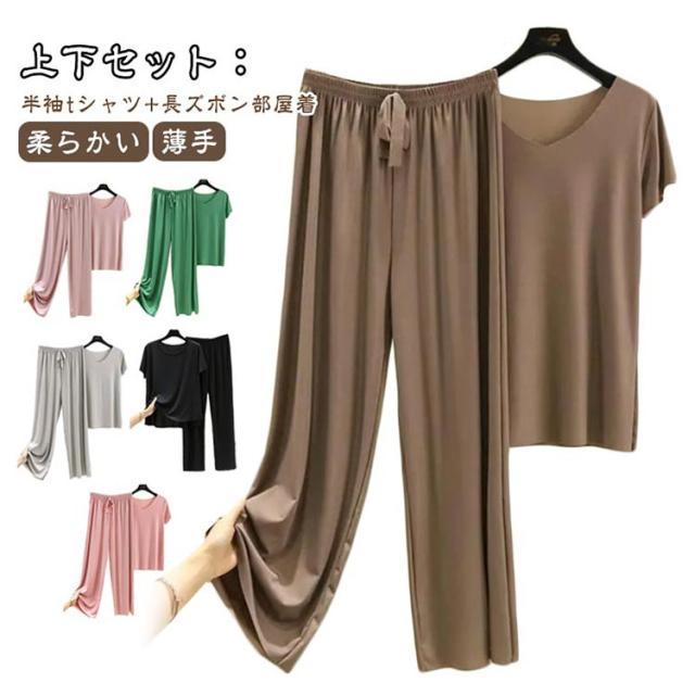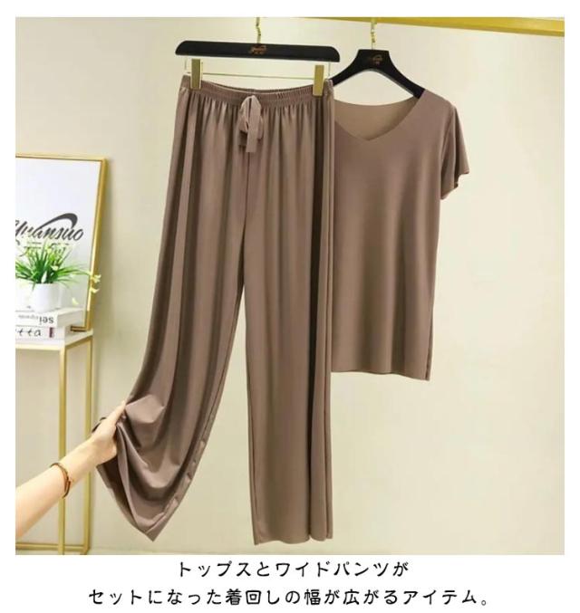 レディース ワイドパンツ 上下セット カットソー 半袖tシャツ 薄手 Tシャツ パジャマ ルームウェア パンツ セットアップ カジュアル ゆったり 長ズボン 柔らかい 無地 部屋着 寝巻き ナイトウェア スポーツ