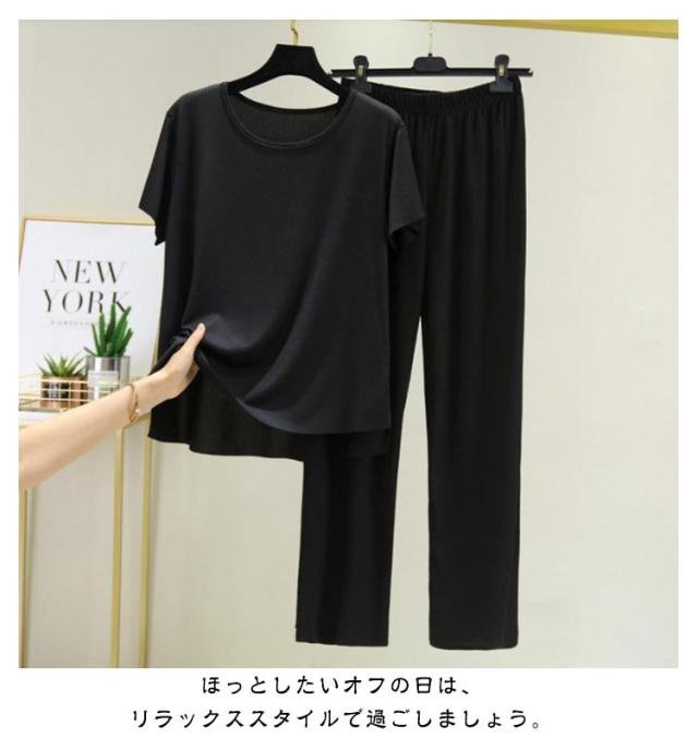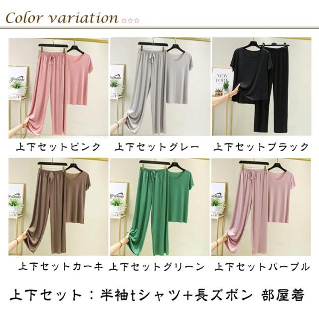 | 上下セット:半袖tシャツ+長ズボン 部屋着 ルームウェアにも寝巻きにも使い回しOK。 ほっとしたいオフの日は、リラックススタイルで過ごしましょう。 トップスとワイドパンツがセットになった着回しの幅が広がるアイテム。 肌触りはやわらかく滑らかでスベスベしています。 眠りを妨げない着心地と肌触りでルームウェアやおやすみ時にもぴったり。 それぞれ別々でもお使いいただけるので、こちら1つでコーディネートの幅がグッと広がります。 | |