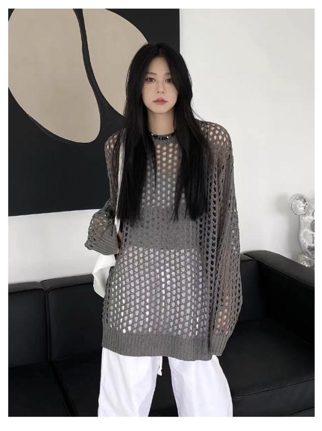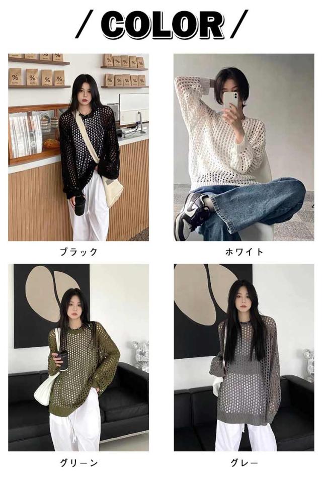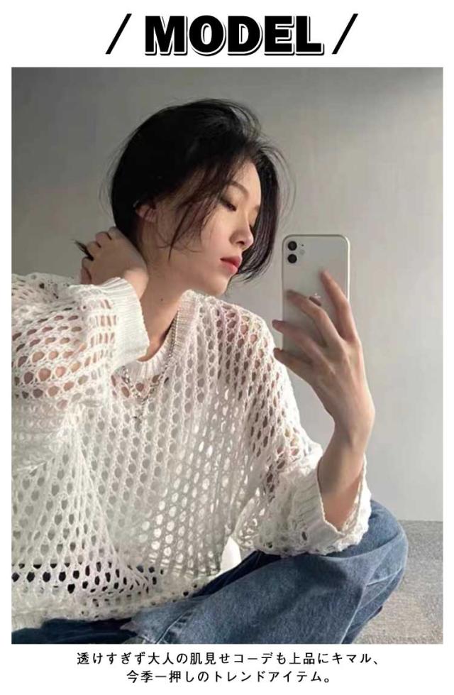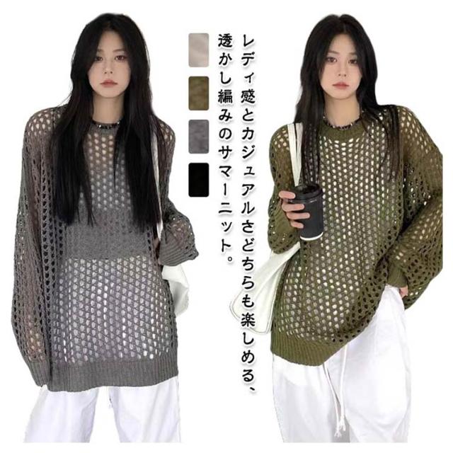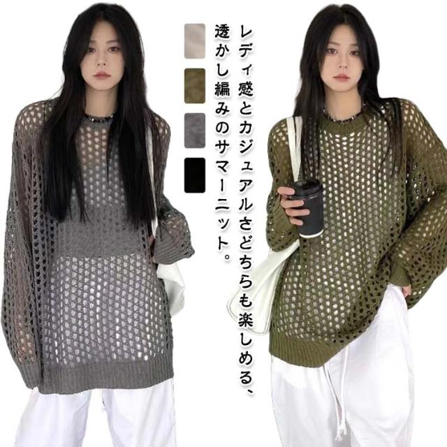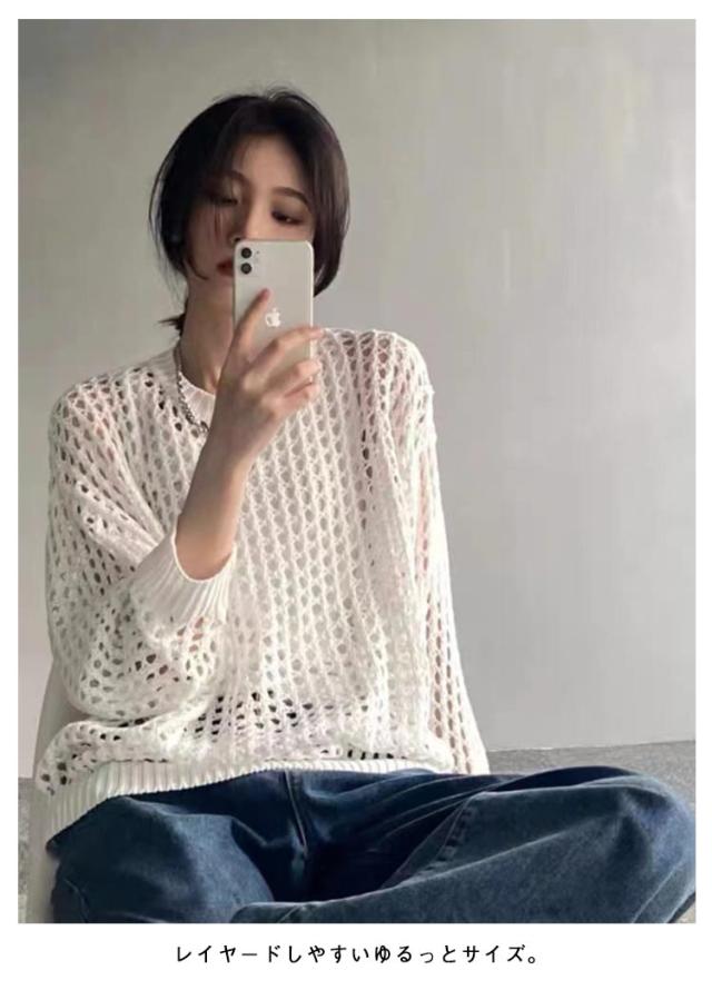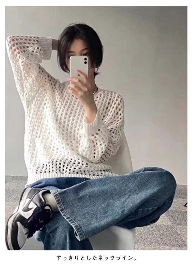 サマーニット 透かし編み 透け感 レディース ラウンドネック 長袖 トップス プルオーバー 後ろボダン付き 無地 大きいサイズ 紫外線 UV対策 ブラウス