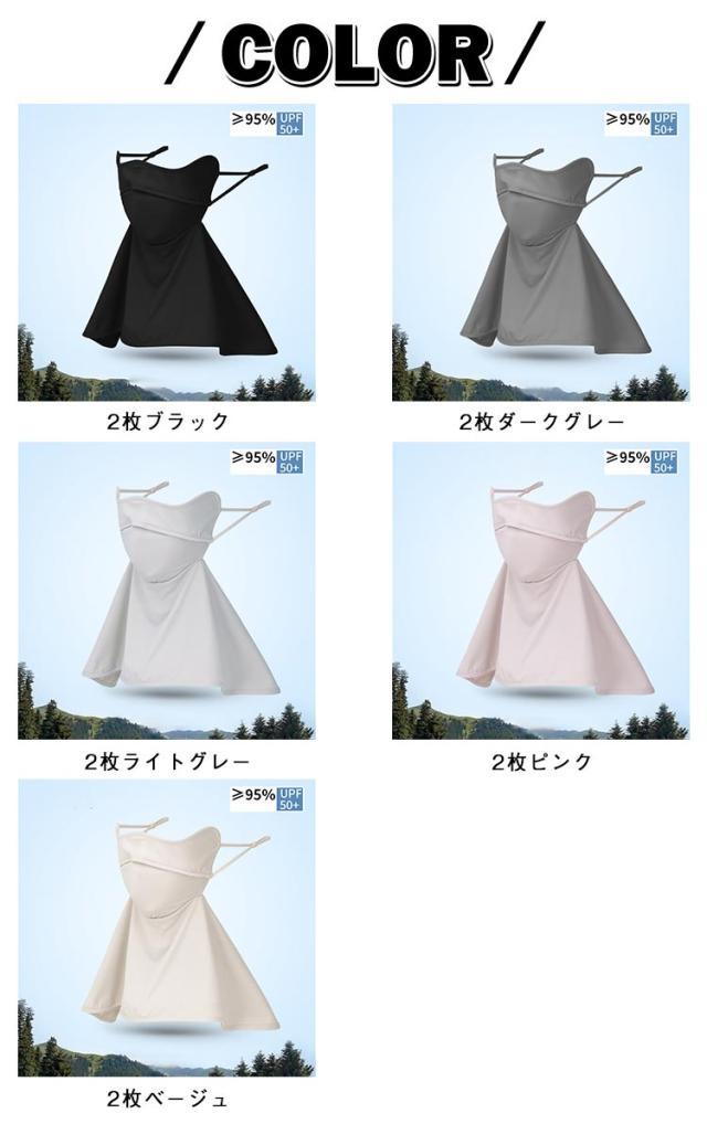 | 接触冷感生地:接触した瞬間からひんやりする!肌触りがすべすべな冷感生地使用、猛暑の日も熱くない。肌に優しく、嫌なチクチク感ゼロ。 通気性抜群:口鼻呼吸用の開口部があり、水分補給の際にカバーを外す必要がありません。マスク裏部分は通気穴付きの生地使用、呼吸がしやすく、夏の息苦しくなとさよなら。 吸汗速乾:汗を快速に吸収し、蒸発する、べたつき感がなくサラサラで気分がスッキリ!そして気化熱の作用で熱気を排出し冷感を長く保つことができる。 UPF50+:UVカット糸の成分が含まれており、高エネルギーの紫外線を吸収し、日焼けの損傷から首と顔を最大限に保護する。何度も洗濯しても効果が低下しない。 耳掛け調節:耳掛け部分は緩みの調節ができ、長時間着用による耳の不快感を解消する。 | |