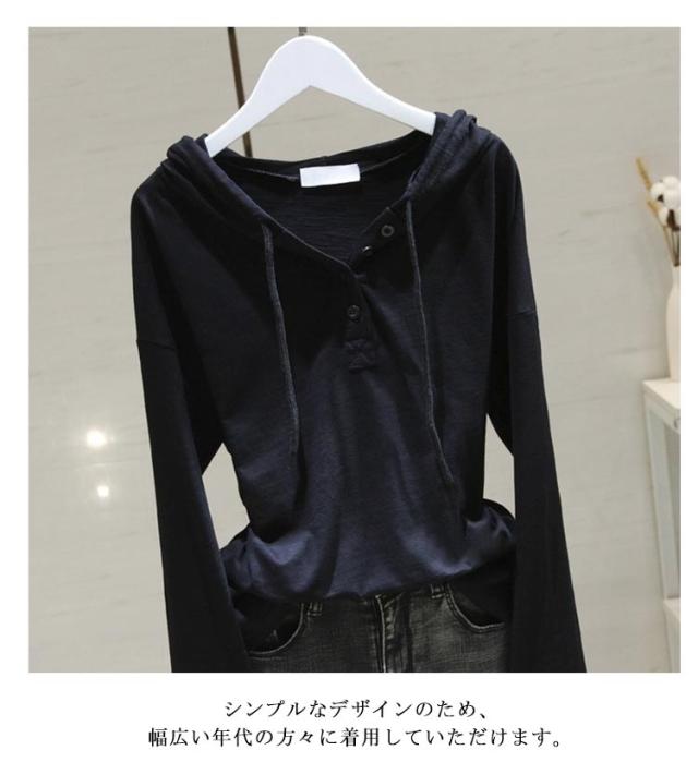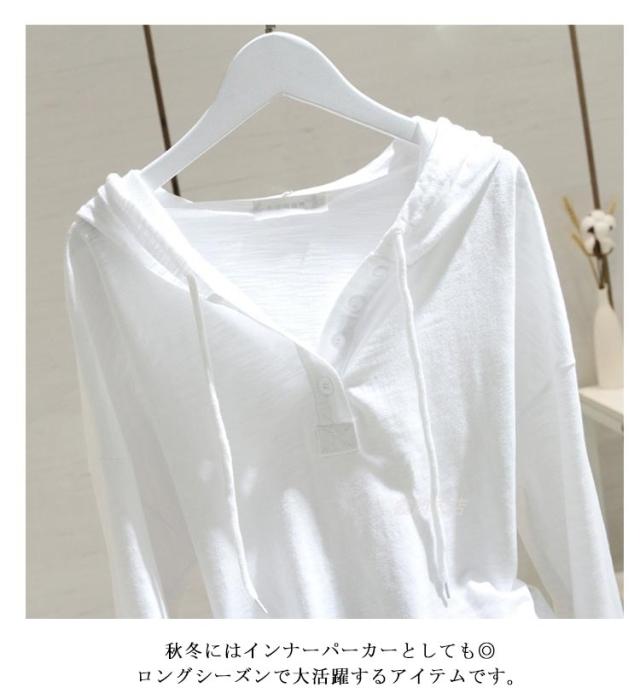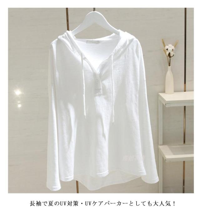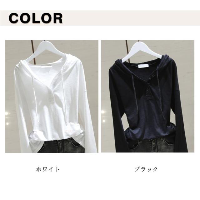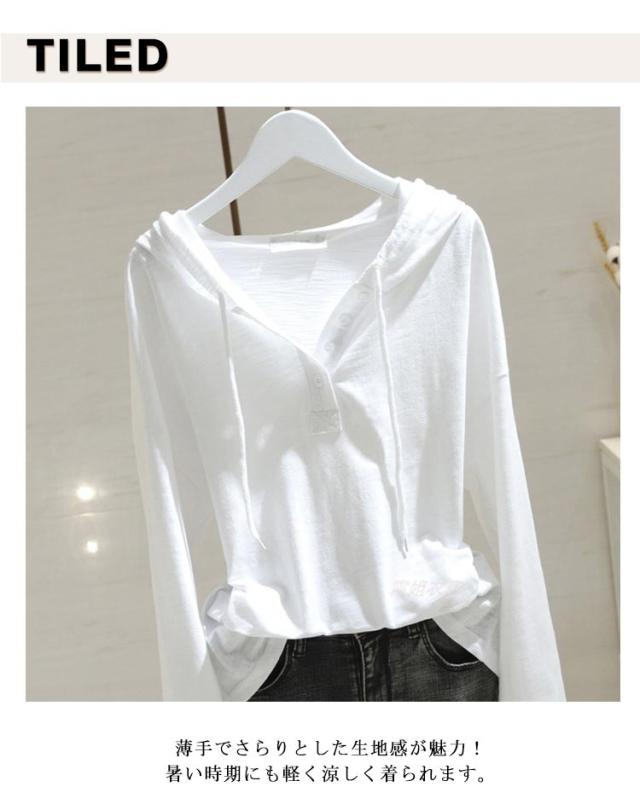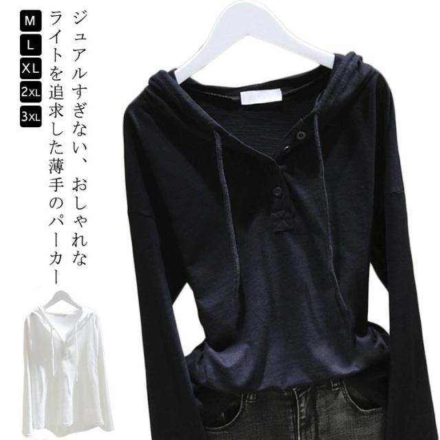 大きいサイズ 夏 レディース パーカー 薄手 フード付き 長袖 コットン 長袖tシャツ tシャツ Vネック ゆったり カットソー 綿混 秋 春 送料無料 トップス フード付き ロンティー 黒 白 ブラック シンプル