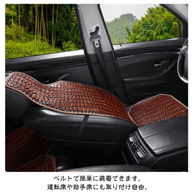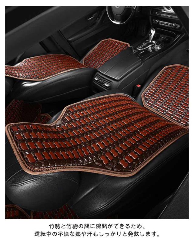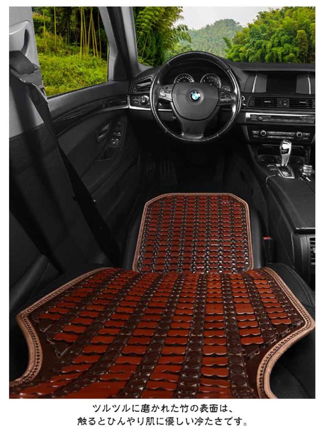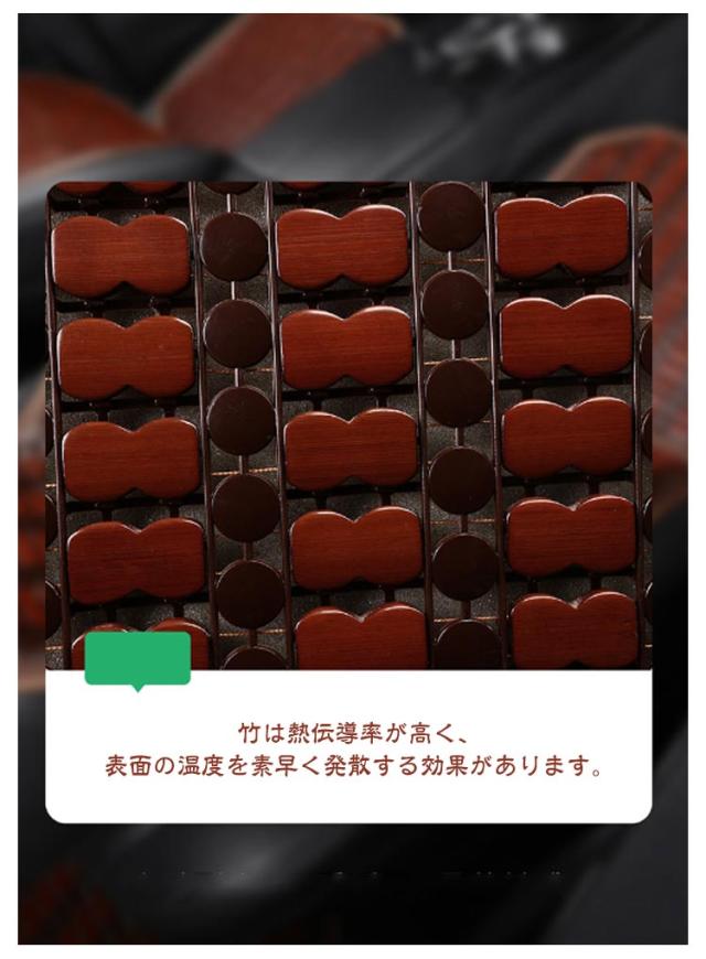 | 背もたれ+座面の2点セット 天然竹を使用したひんやり快適カーシートカバー。 竹は熱伝導率が高く、表面の温度を素早く発散する効果があります。 ツルツルに磨かれた竹の表面は、触るとひんやり肌に優しい冷たさです。 竹駒と竹駒の間に隙間ができるため、運転中の不快な熱や汗もしっかりと発散します。 ベルトで簡単に装着できます。運転席や助手席にも取り付け自由。 | |