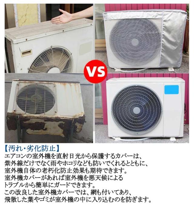 | 2枚セット 【エアコン室外機カバー】オックスフォードの生地(撥水加工)厚みのある構造でエアコン室外機をしっかり守ります。エアコンの設置に必ず必要な室外機は、屋外に設置するため、むき出しで放置しておくと、夏場の直射日光や、冬の積雪、激しい雨や強風など様々な悪天候によりトラブルを招くことがあります。このエアコン室外機カバーがあれば室外機を悪天候から守ります。 【汚れ・劣化防止】エアコンの室外機を直射日光から保護するカバーは、紫外線だけでなく雨やホコリなども防いでくれるとともに、室外機自体の老朽化防止効果も期待できます。室外機カバーがあれば室外機を悪天候によるトラブルから簡単にガードできます。この改良した室外機カバーでは、網も付いてあり、飛散した葉やゴミが室外機の中に入り込むのを防ぎます。 【遮熱・負担軽減】最新型の改良したエアコン室外機遮熱カバーでは、光反射素材を採用、約40%の熱線をカットし、冷房運転中の室外機の負担を軽くする!直射日光から室外機を守り、 冷房効率のUPを助けます。エコ・節電も期待できる優れな製品です。 【省エネ・取付け簡単】省エネ最新設計のエアコン室外機カバーは、厚みのある構造でしっかり断熱直射日光を遮り、廃熱効果が高まりますので節電・省エネ対策になります。設置し易く、取り外しも簡単です。カバー下部に固定用紐があって縛ることによって取付固定されます。また使用しない時にはコンパクトに収納でき、劣化して処分する際も便利です。 【悪天候対策】このエアコン室外機遮熱カバーは撥水加工生地を採用しているので、雨水を撥ね付け、泥やホコリなどがこびりつくのを防止できます。直射日光、雨、雪などの過酷な環境から室外機を守ってくれ♪雨天でも快適に過ごせます。耐候性に優れているので、オールシーズンOK!台風や、梅雨などの雨の季節には飛散した泥水や葉が室外機中に入り込むのを防ぎます。縛っておけば台風でも飛んで行かないし、寒冷地で積雪にも耐えて破損もしてないので堅牢性が高いです。(ご注意事項:室外機側面などの「通風孔」をふさがずにご利用ください。) | |