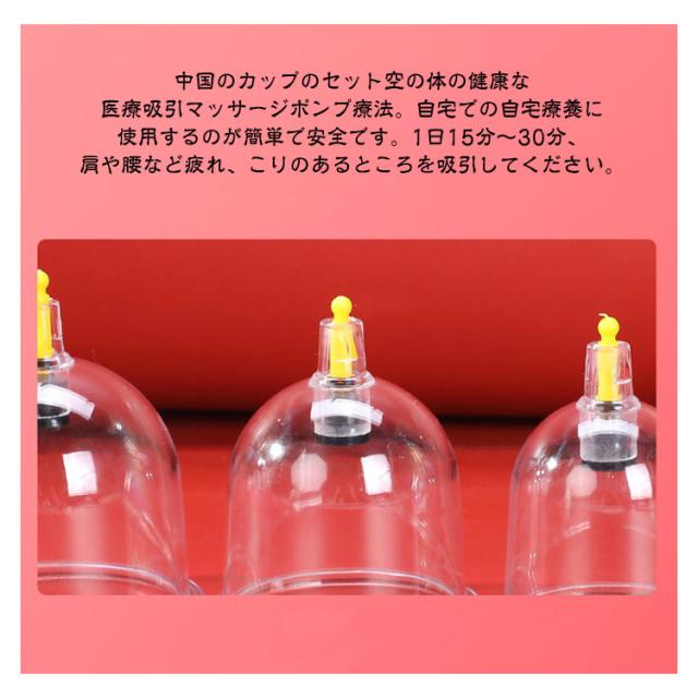 | サイズについての説明 | 【お勧めポイント】 01.流線型のカップ デザインにこだわった流線型のカップが新しい感触を提供し、高い透明度がより快適な視覚体験をもたらします。 02.缶の口が丸くて滑らか 缶口は丸く滑らかで、使用時の痛みが少なく、皮膚損傷を起こしにくく、密封性が良い です。 03.操作簡単 伝統的なカッピングセラピーと磁気療法を組み合わせて、伝統的なカップをベースにしたプラスチックカップ。 04.高品質な材質 プラスチック製のカップなので、割れやすいガラス製に比べ安全に使用できます。カップはお湯で沸かして消毒が可能、いつもきれいにご使用頂けます。 05.火を使う必要はない 火傷の危険を避けるために火を使う必要はありませんので、安全保障があります。 【使用方法】 1.部位を特定してください。 2. カップをお肌に直接当てて、専用ポンプで中の空気を抜きます *吸引力は、ポンピングの回数で調整してください。 *強く抜きすぎないようにご注意ください。 3.*皮膚が乾燥していると肌が荒れる可能性や、ちゃんと吸引でき ない場合がありますので、ローションなどを塗ってからご使用く ださい。吸い玉の使用時間は、5分程度を目安に使用してくださ い。 |