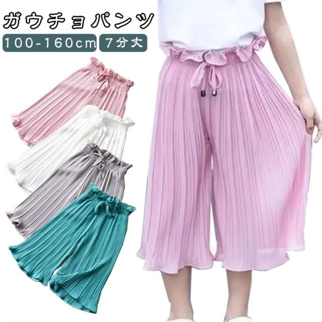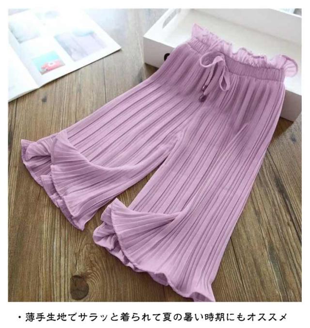 ジュニア 着回し ウエスト紐 子供服 ワイドパンツ ロングパンツ スカーチョ ボトムス ガウチョパンツ 女の子 ウエストゴム フレア シフォン プリーツ ガウチョパンツ 薄手 長ズボン ひらひら 単色 無地 ガーリー かわいい おしゃれ キュート キッズ お出かけ 通学 100-160cm