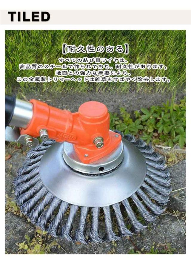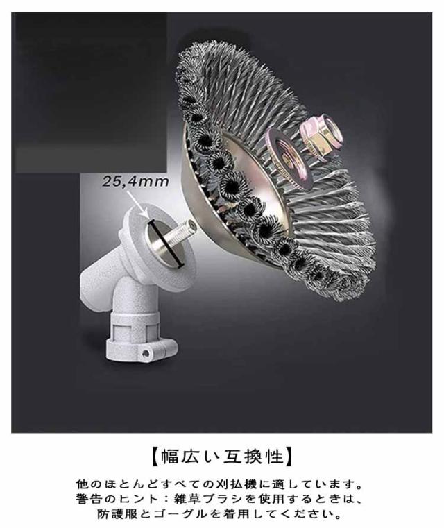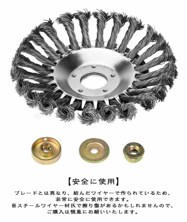 | お庭の手入れに使える草刈り機の交換用ブラシカッター。草刈機用チップソー 【耐久性のある】すべての結び目ワイヤは、高品質のスチールで作られており、耐久性があります。地面との強力な摩擦により、この金属製トリマーヘッドは雑草をすばやく除去します。 【安全に使用】ブレードとは異なり、結んだワイヤーで作られているため、非常に安全に使用できます。 ※スチールワイヤー材氏で擦り傷があるかもしれませんので、ご購入は慎重にお願いいたします。 【幅広い互換性】他のほとんどすべての刈払機に適しています。 警告のヒント:雑草ブラシを使用するときは、防護服とゴーグルを着用してください。 【さまざまな用途】このチップソーは、庭、歩道の草刈だけではなく、レンガの縫い目などに苔取り、バリ取り、粉塵除去、酸化物除去、クリーニングなどにも適しています。石やハードブロックを打つとき、それは正常に動作することができます。 | |